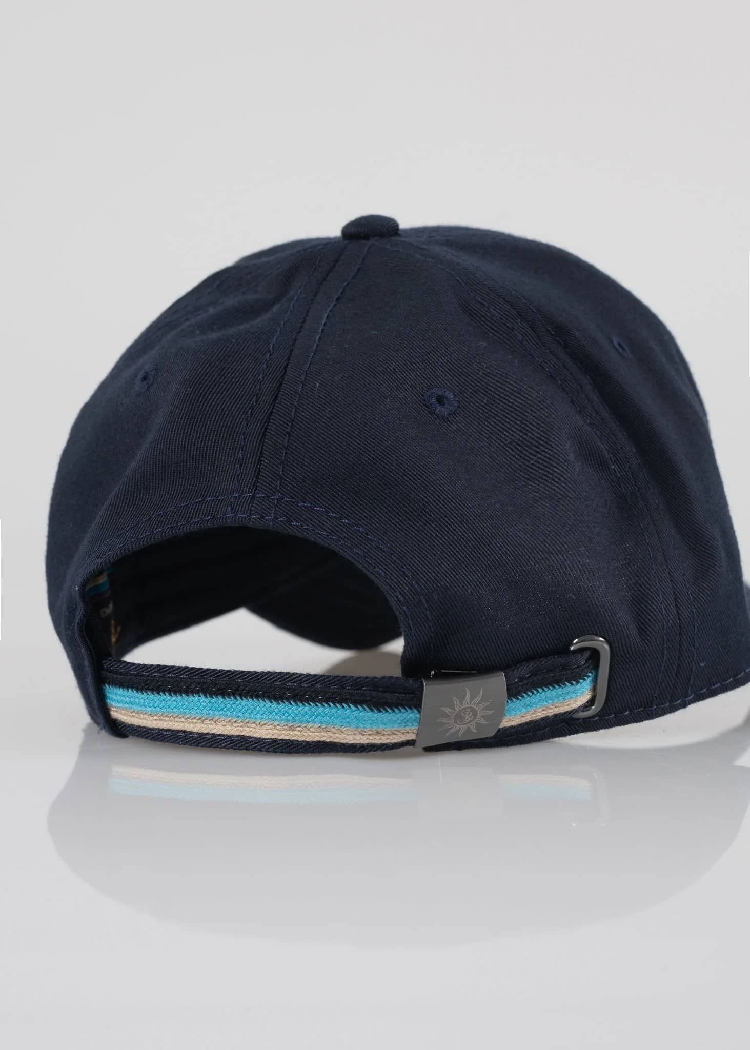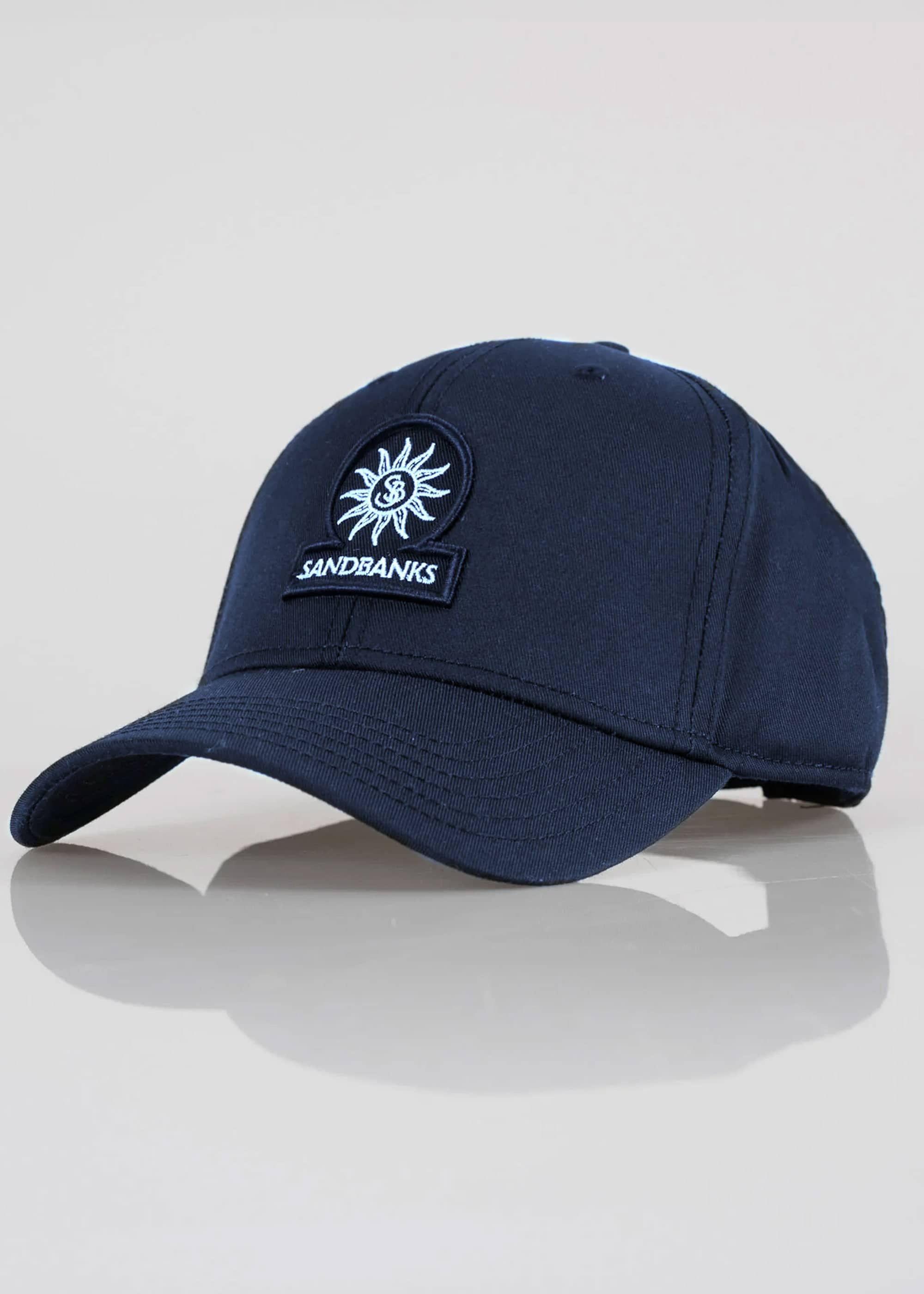 Sandbanks Badge Logo strap-back cap in navy made from 100% recycled polyester and features navy badge with white embroidery, knitted tri-colour rear strap and laser engraved SB logo fastener in gun metal.