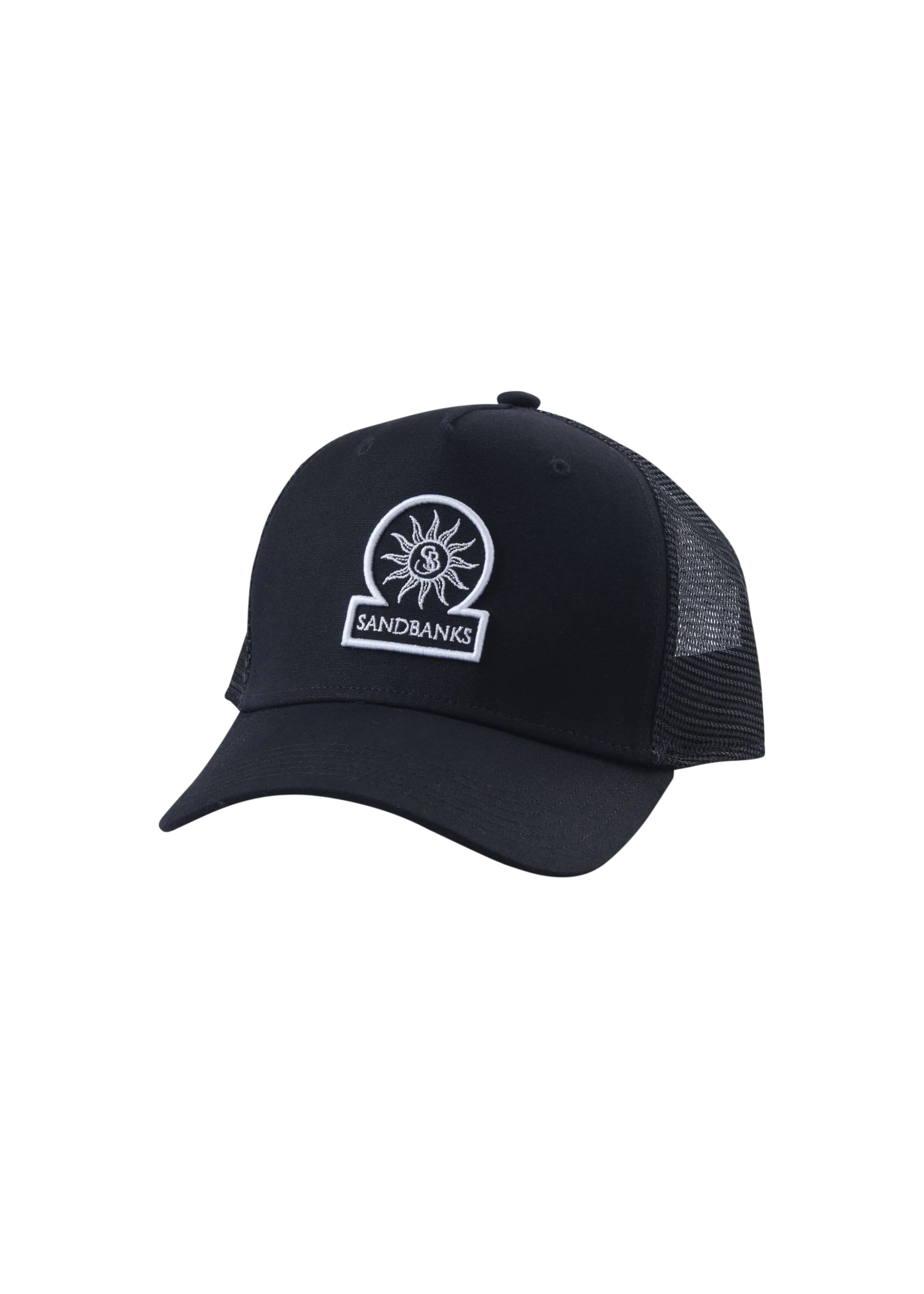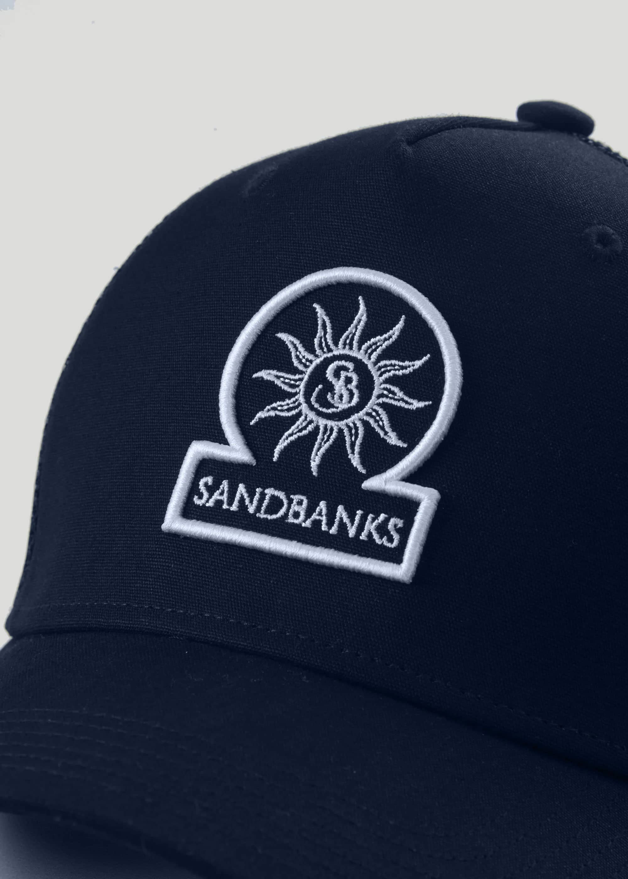 Sandbanks Badge Logo mesh back cap in navy made from 100% organic cotton featuring white embroidered badge logo.