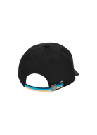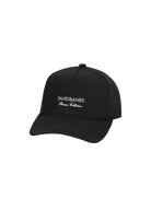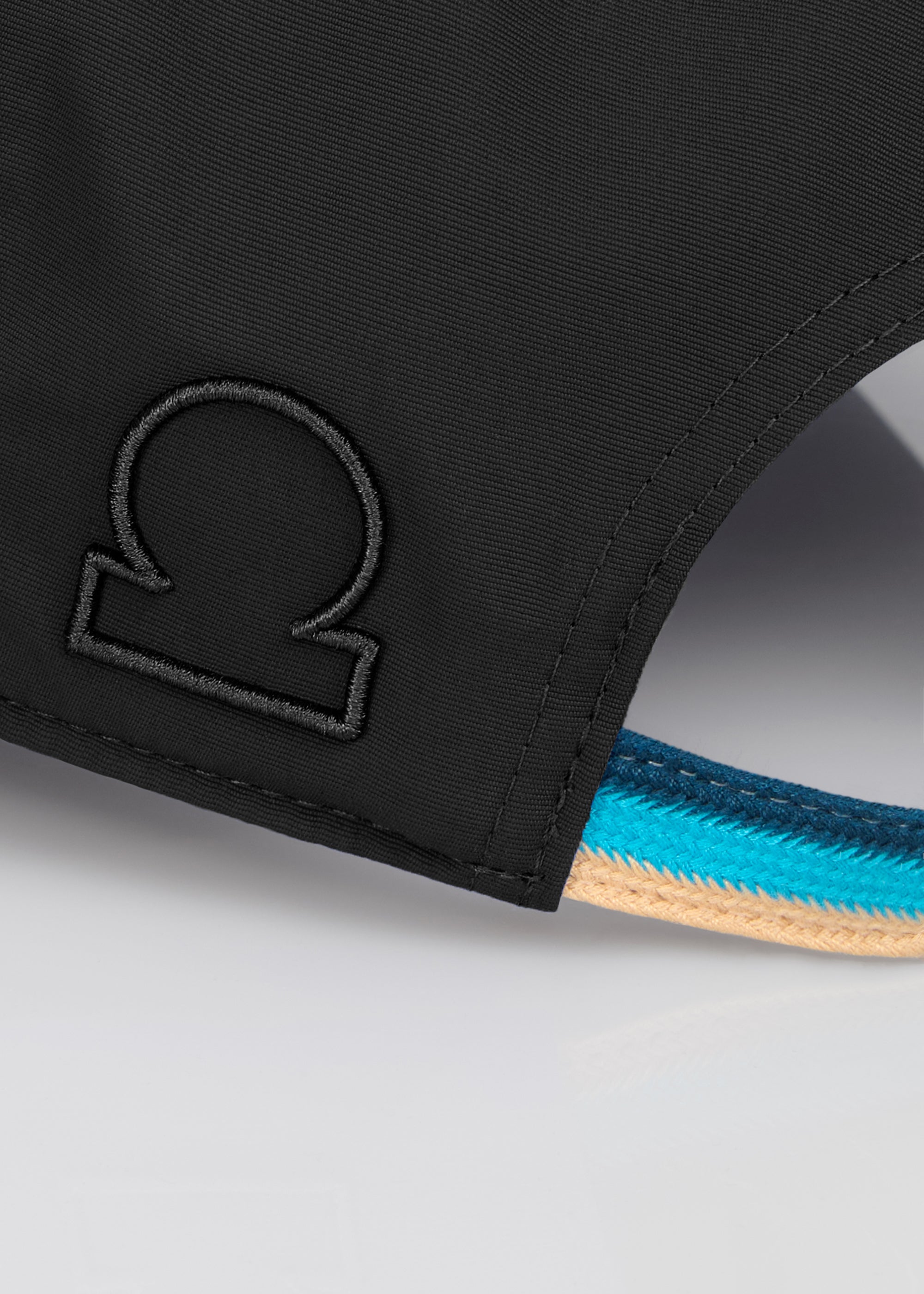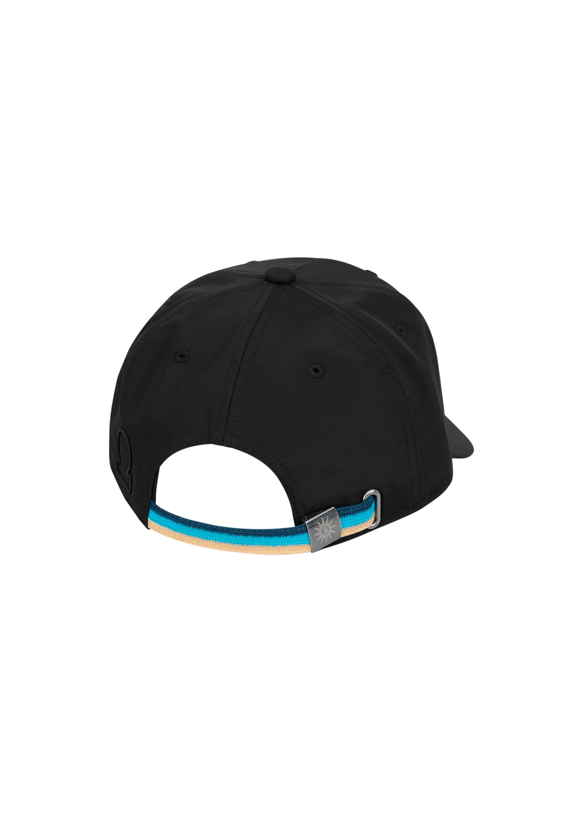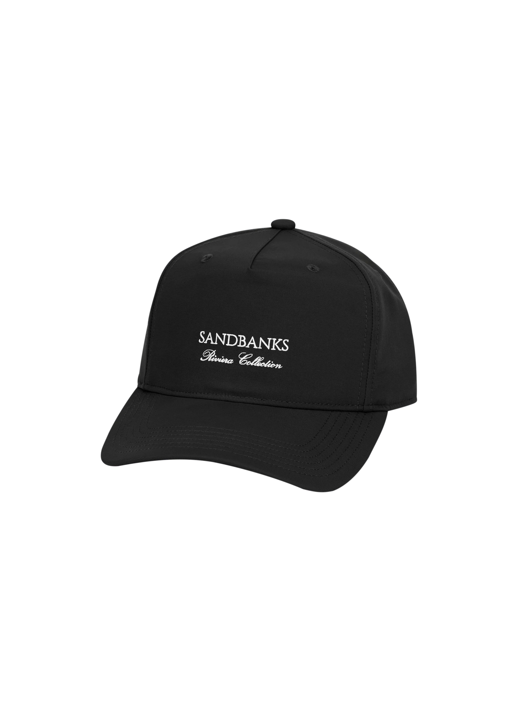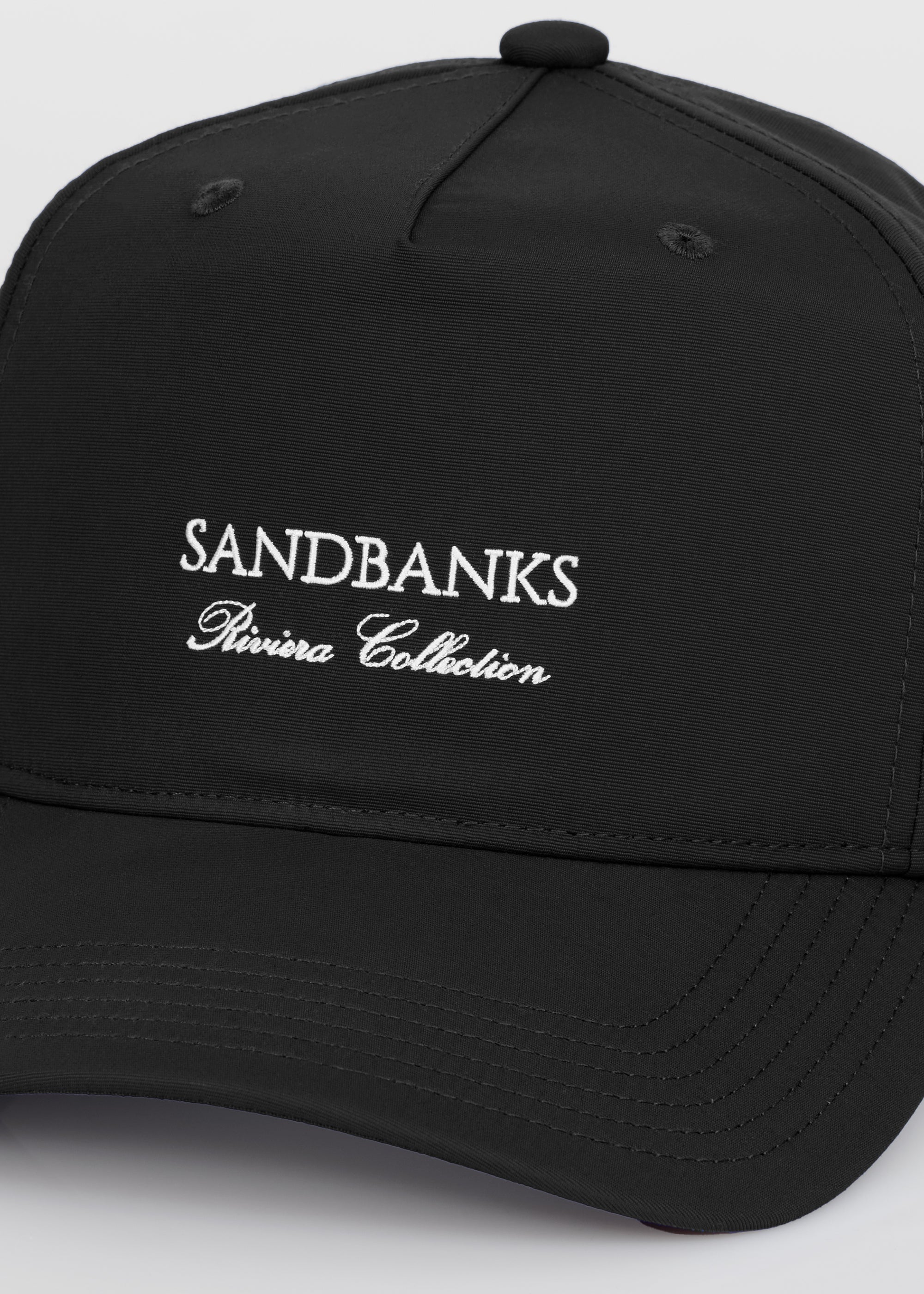 The Sandbanks Riviera Collection cap in black is crafted from recycled nylon and displays a finely embroidered Sandbanks Riviera Collection logo on the front and signature logo outline on the side. It offers a contemporary trucker-style fit, complete with a tri-colour strap at the back and a laser-engraved SB gunmetal fastener for precise adjustment.