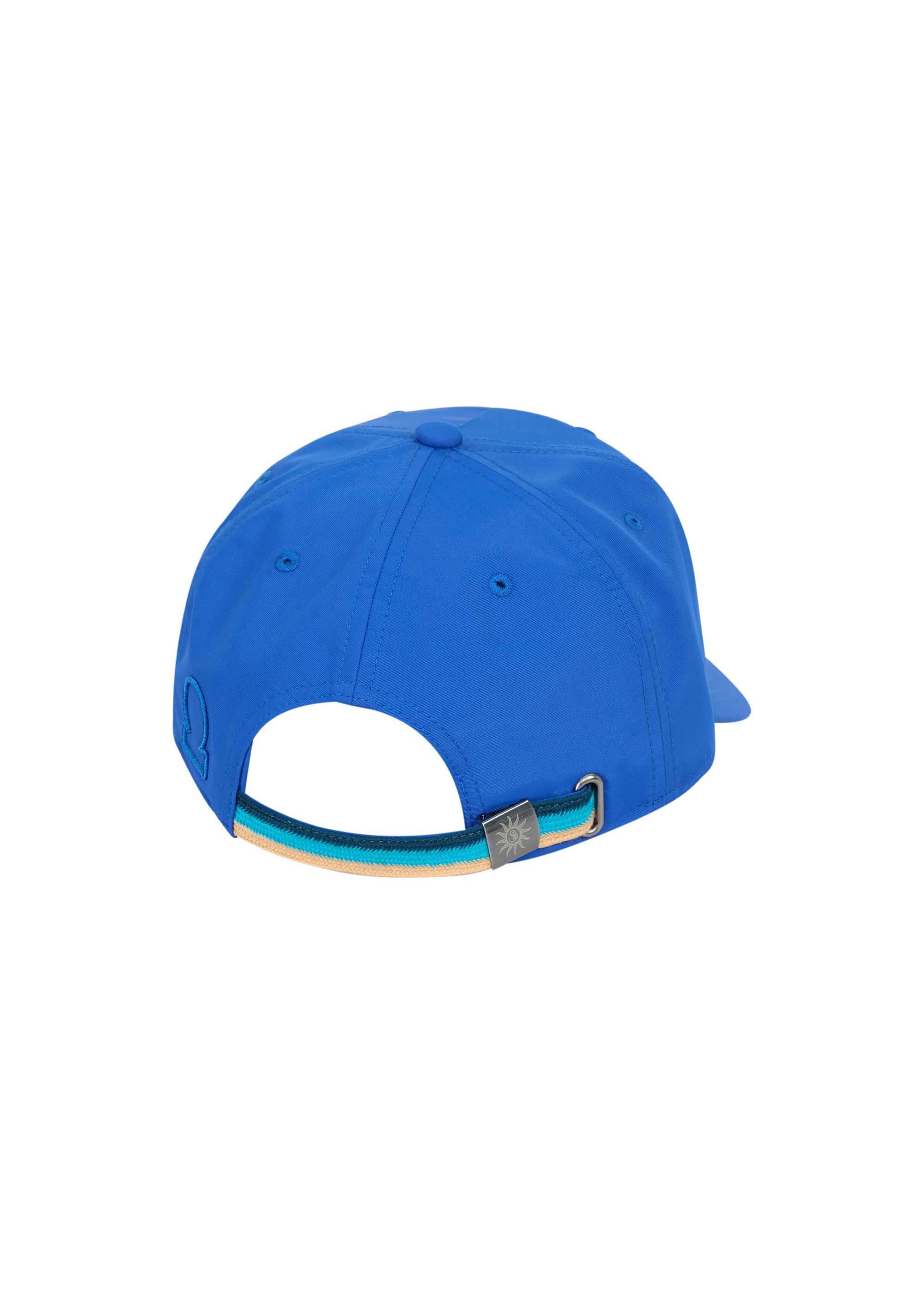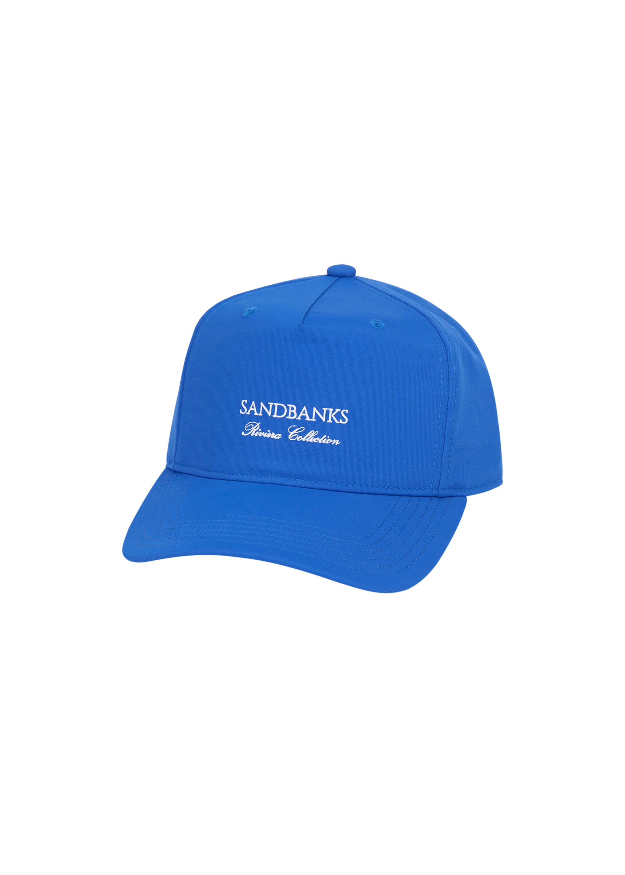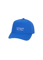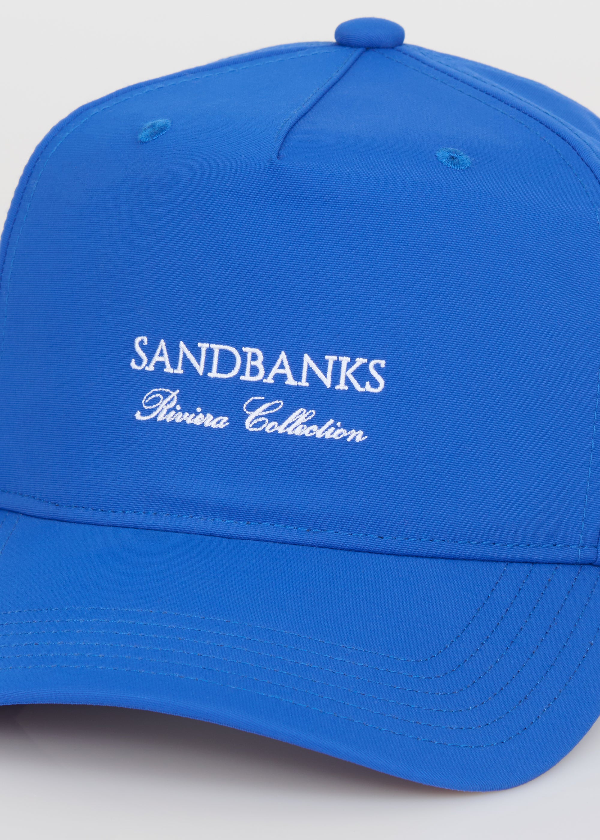 The Sandbanks Riviera Collection cap in cobalt blue is crafted from recycled nylon and displays a finely embroidered Sandbanks Riviera Collection logo on the front and signature logo outline on the side. It offers a contemporary trucker-style fit, complete with a tri-colour strap at the back and a laser-engraved SB gunmetal fastener for precise adjustment.