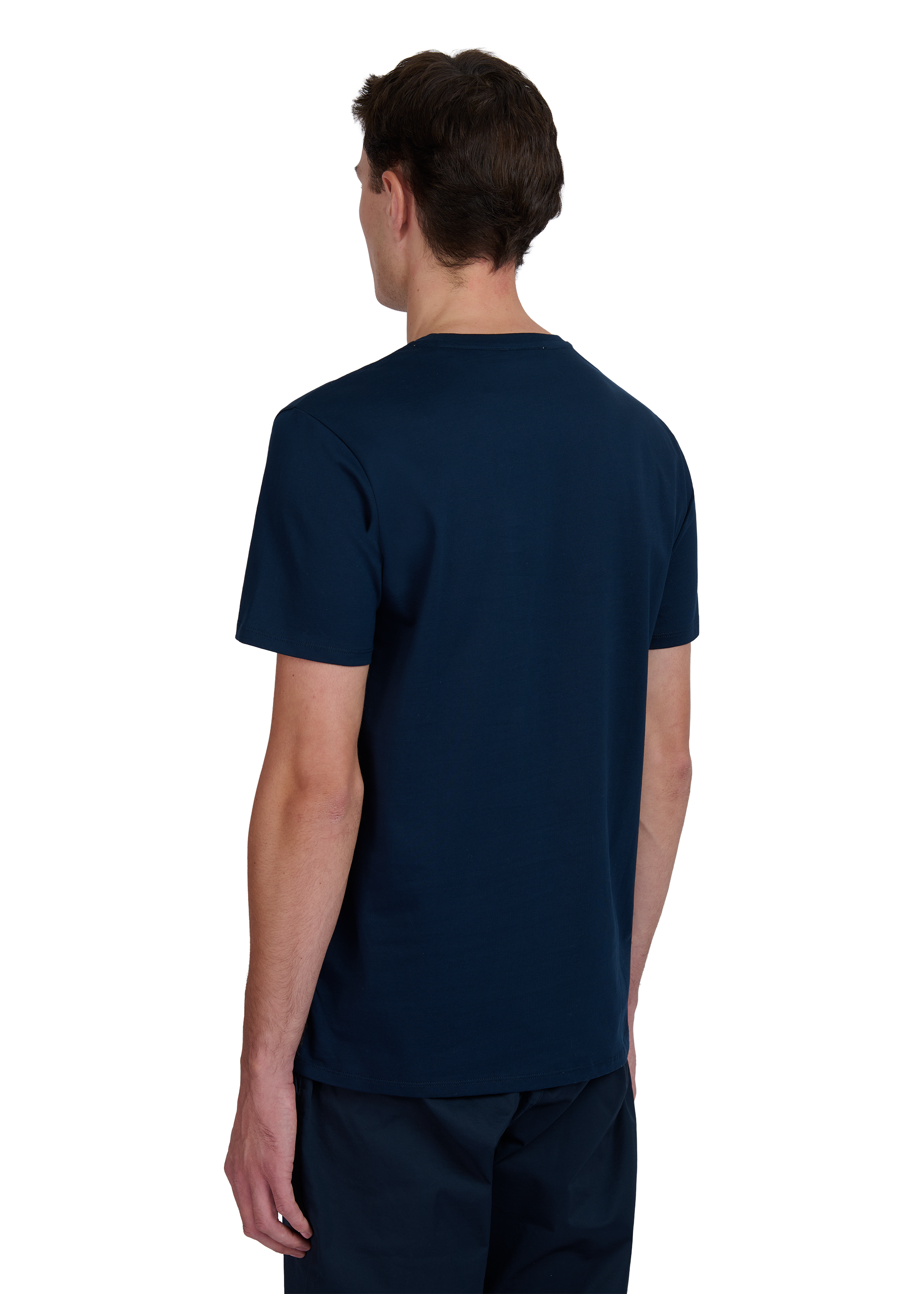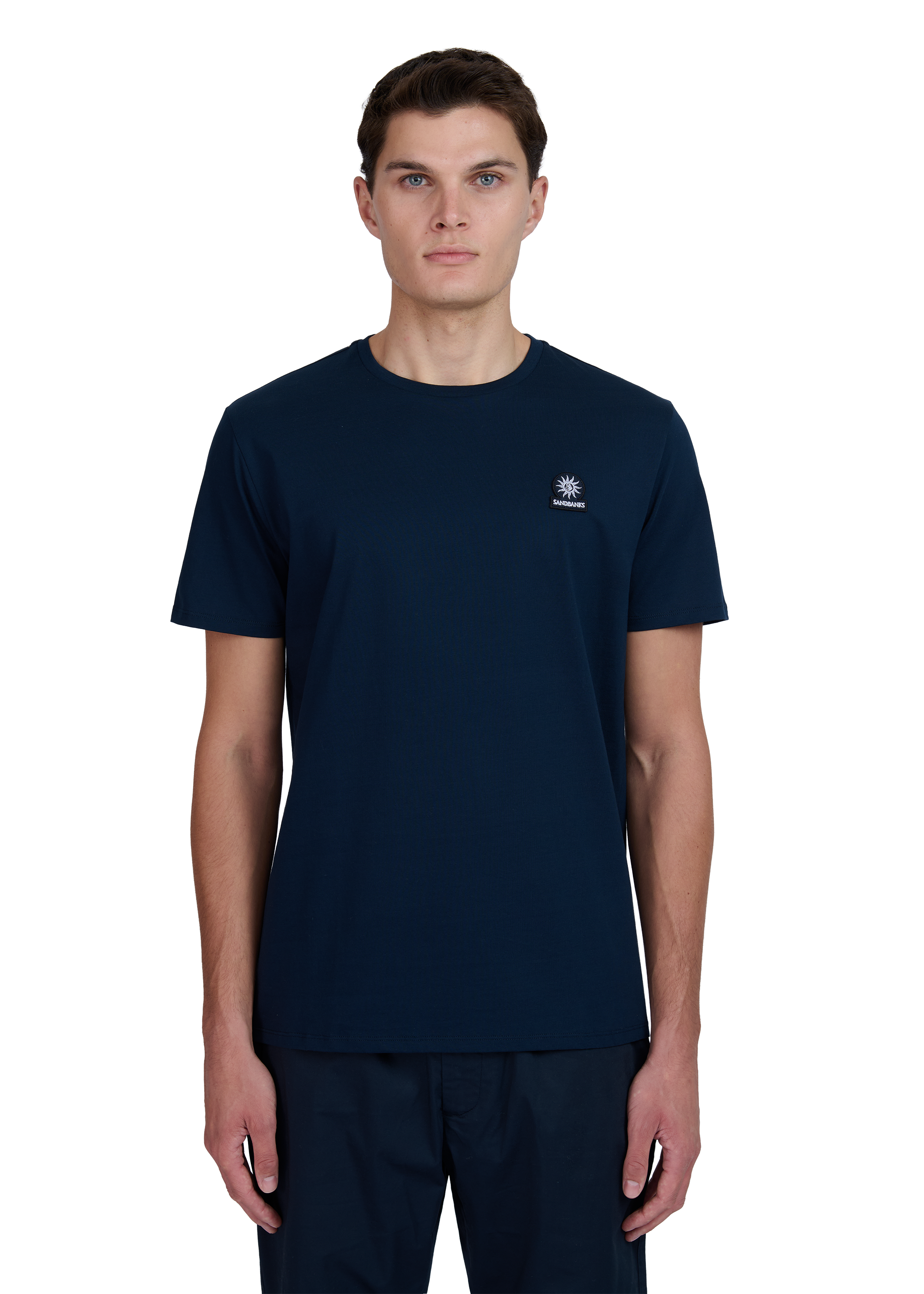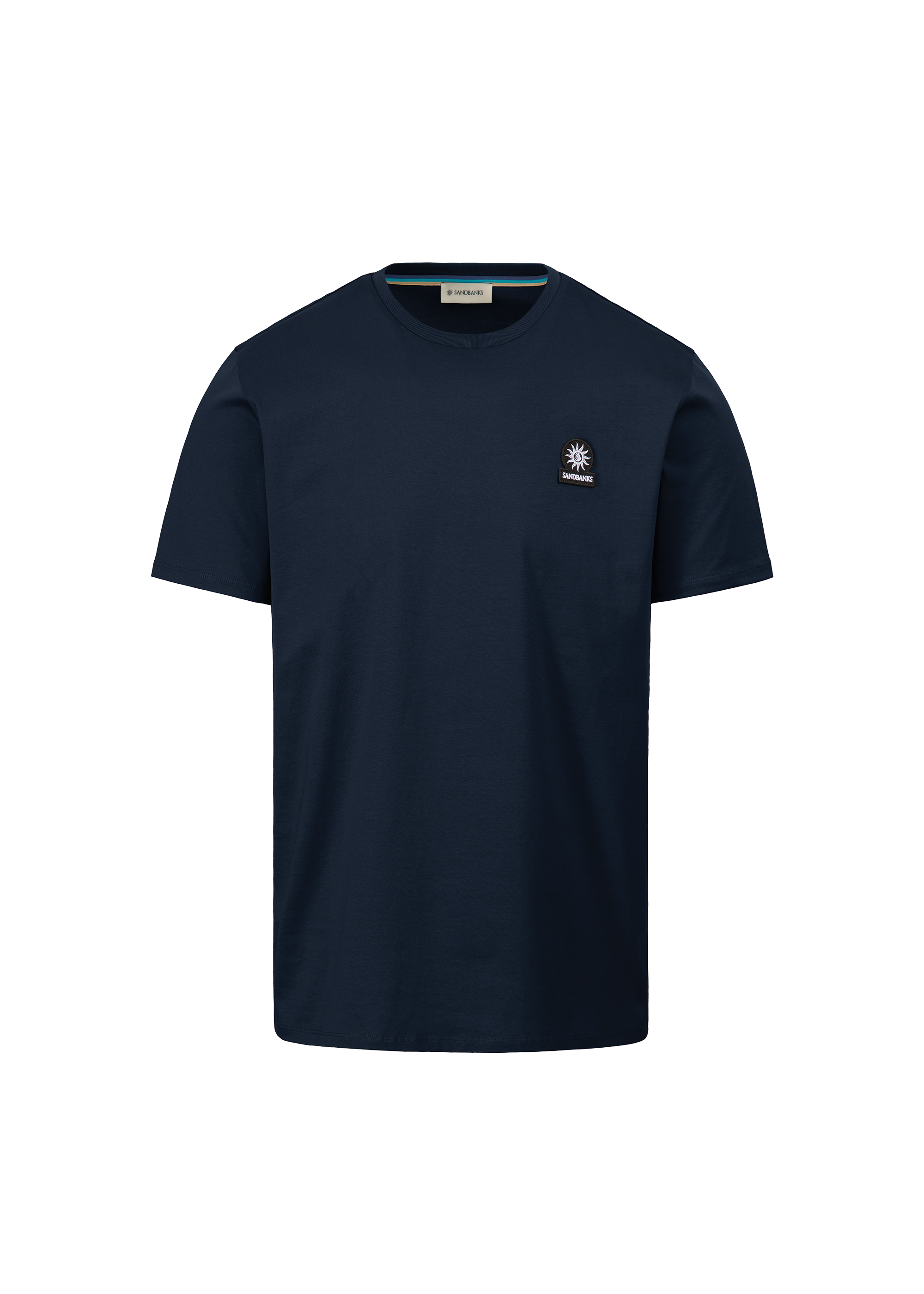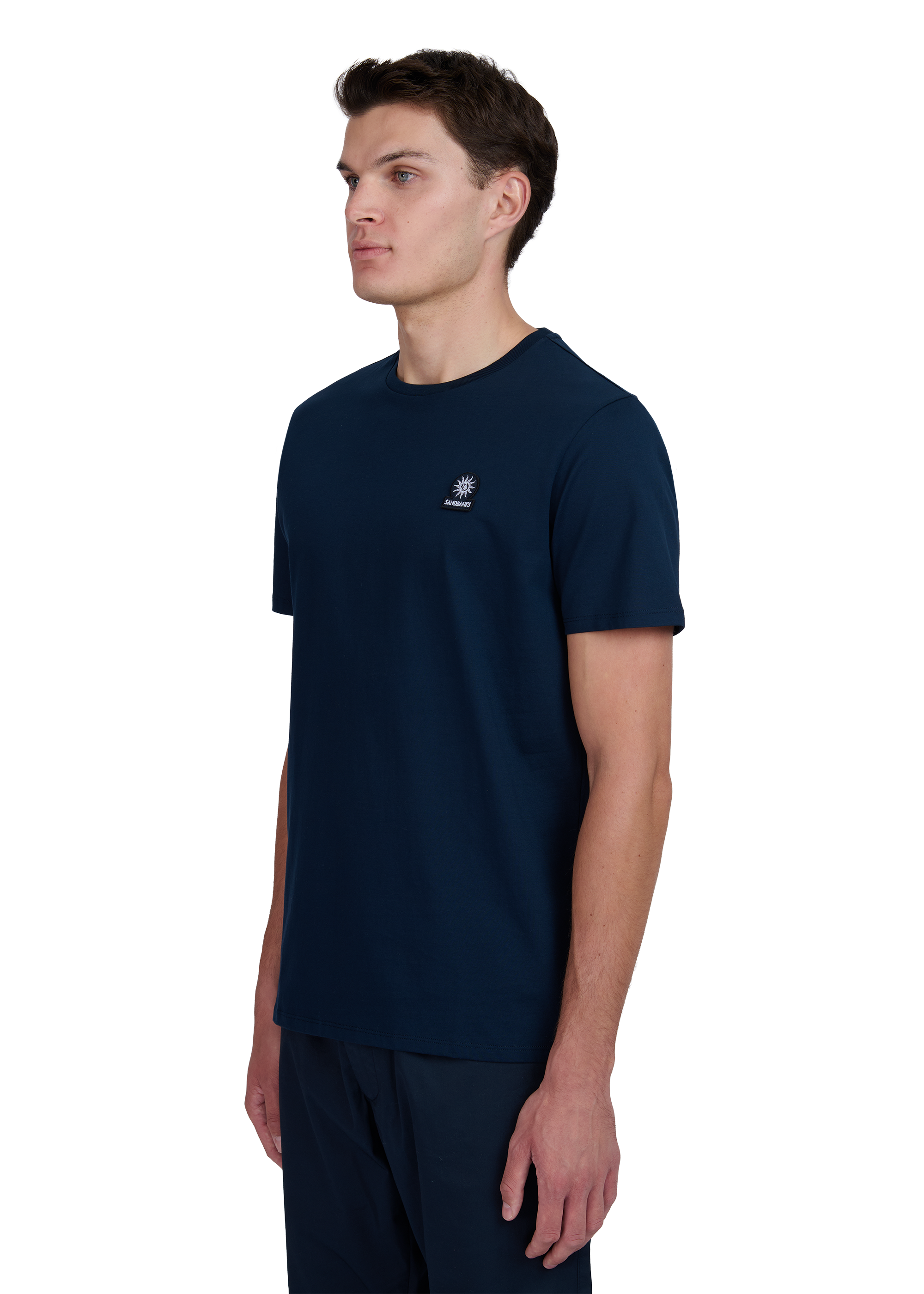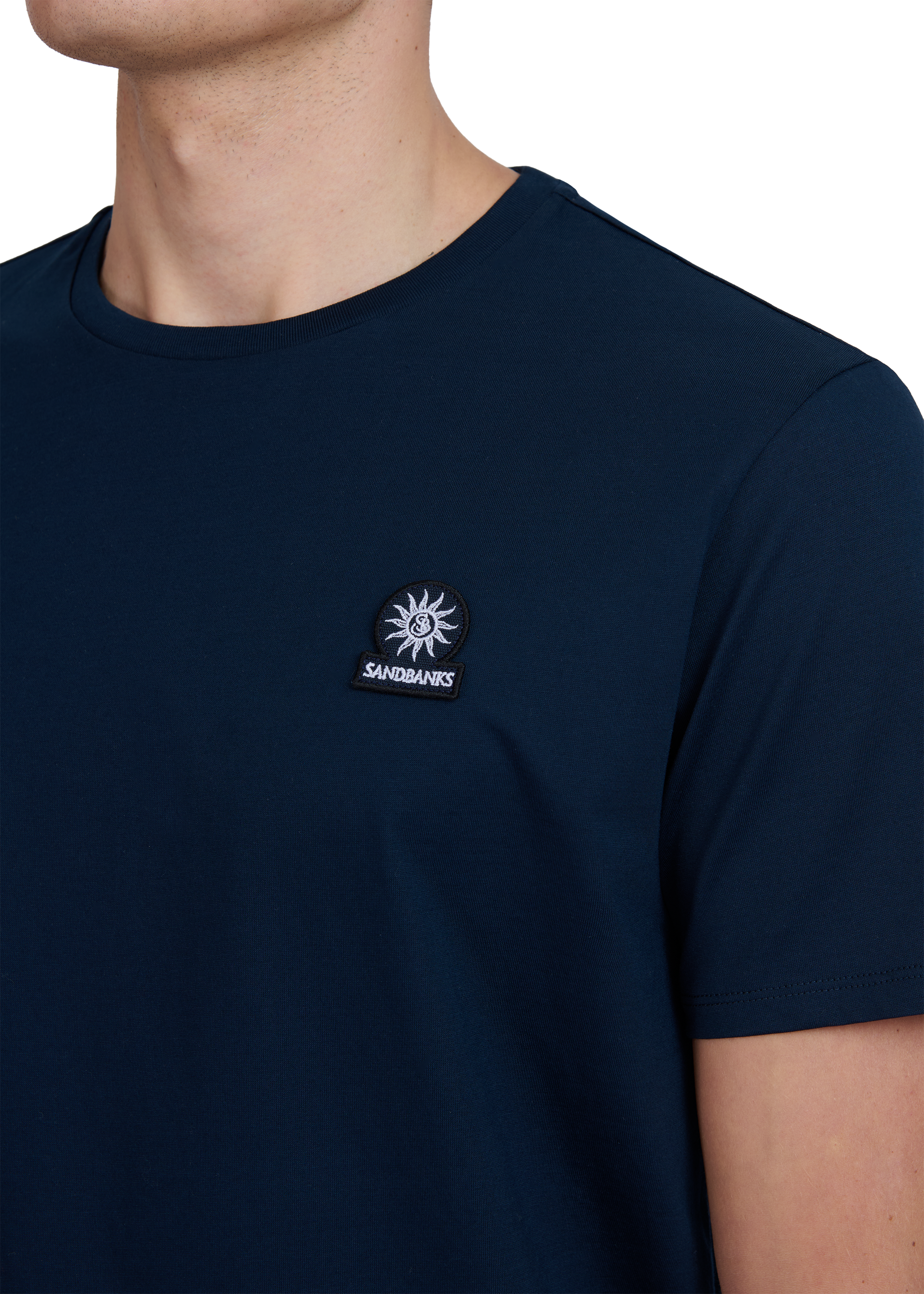 Sandbanks men's badge logo t-shirt in navy, made from mercerised cotton for a silky and luxurious feel. This classic fitting crew neck t-shirt features an embroidered badge logo on the chest and tri-colour back neck binding.
