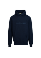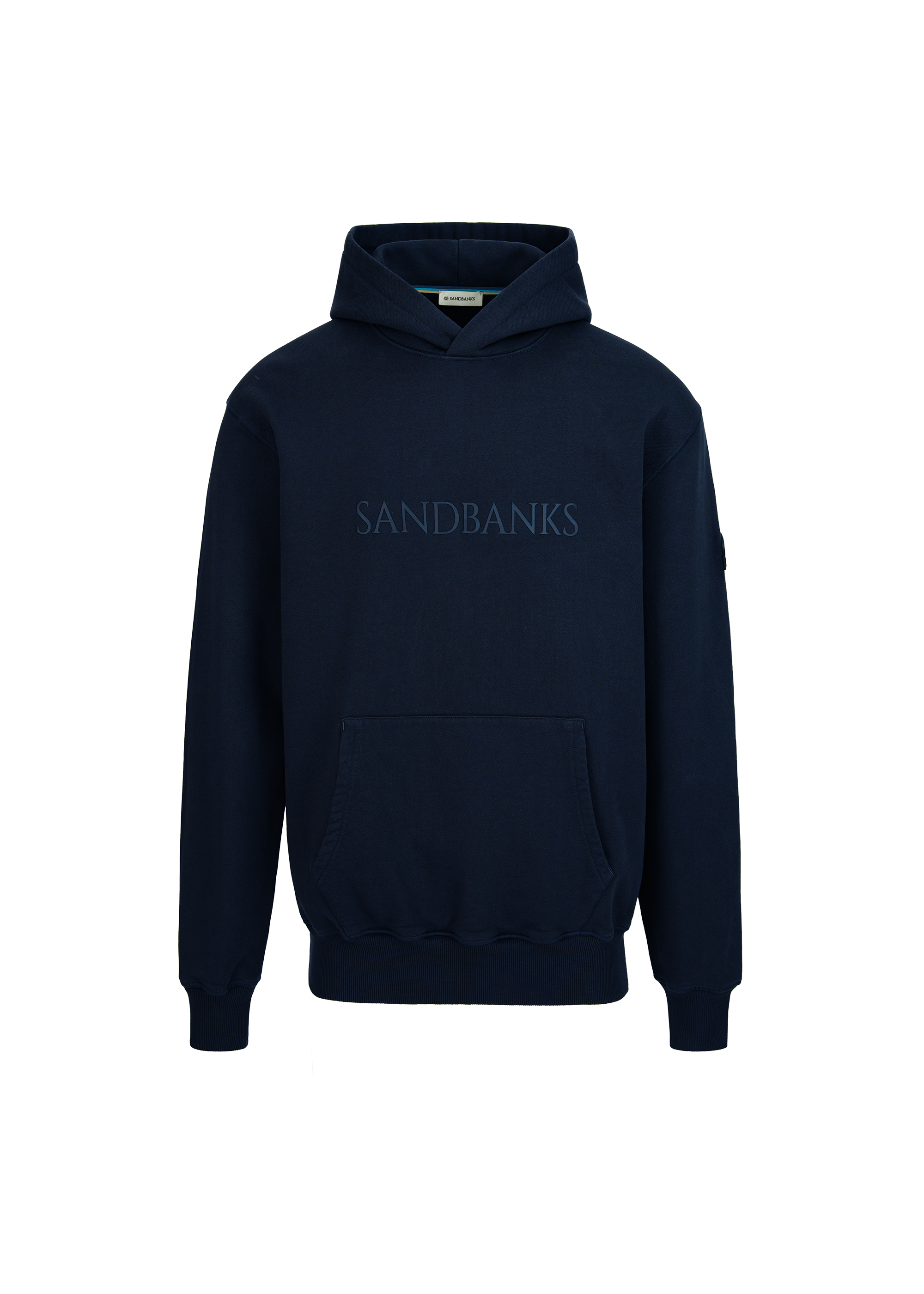 Sandbanks 3D silicone logo hoodie in navy, made from 100% organic cotton diagonal weave knit that is brushed internally for a soft and warm feel. This hoodie features a Sandbanks rubber print on chest, rubber badge logo on the sleeve, cover stitch details, tri-colour neck binding, ribbed cuff and hem.