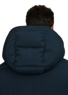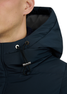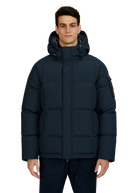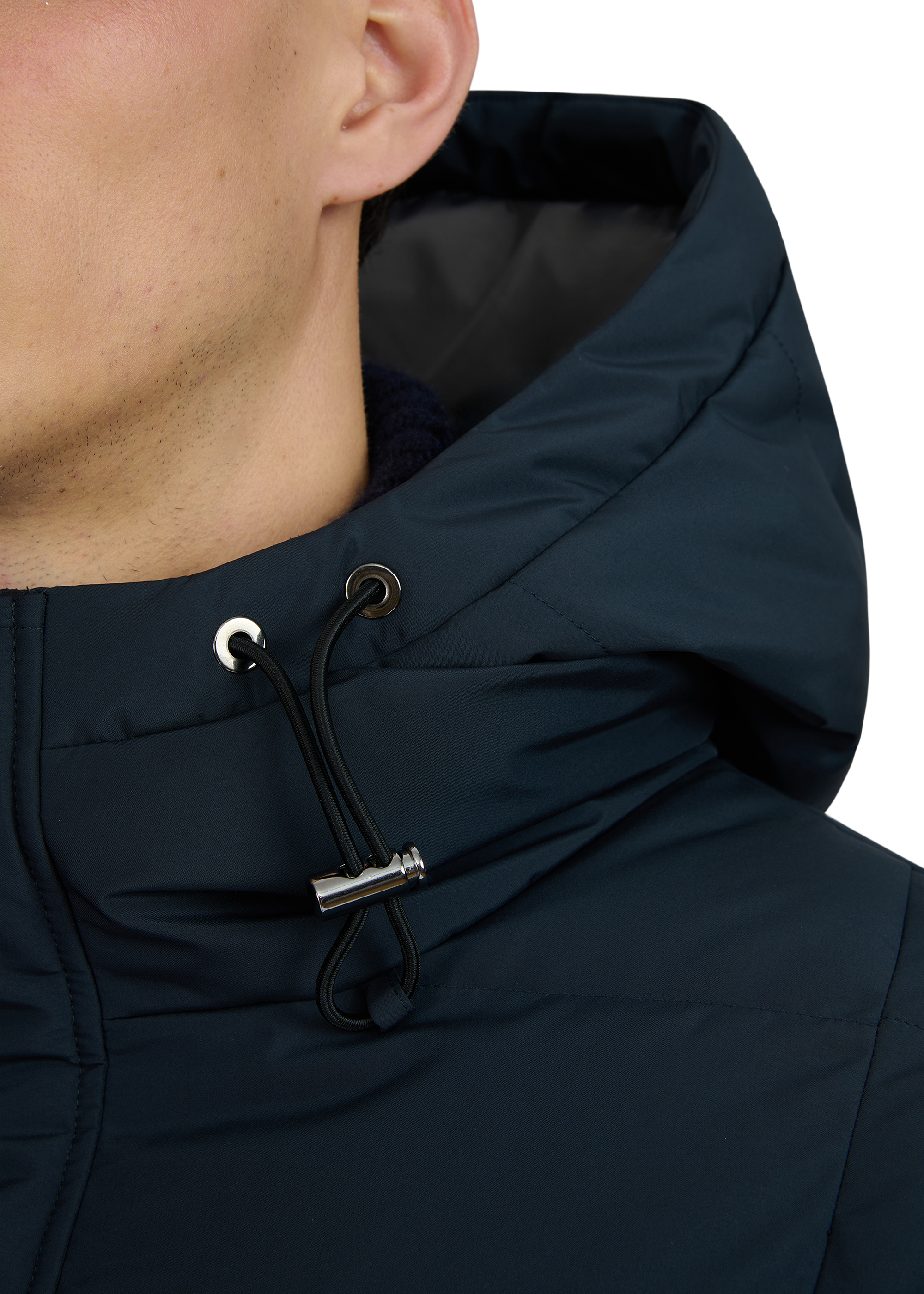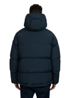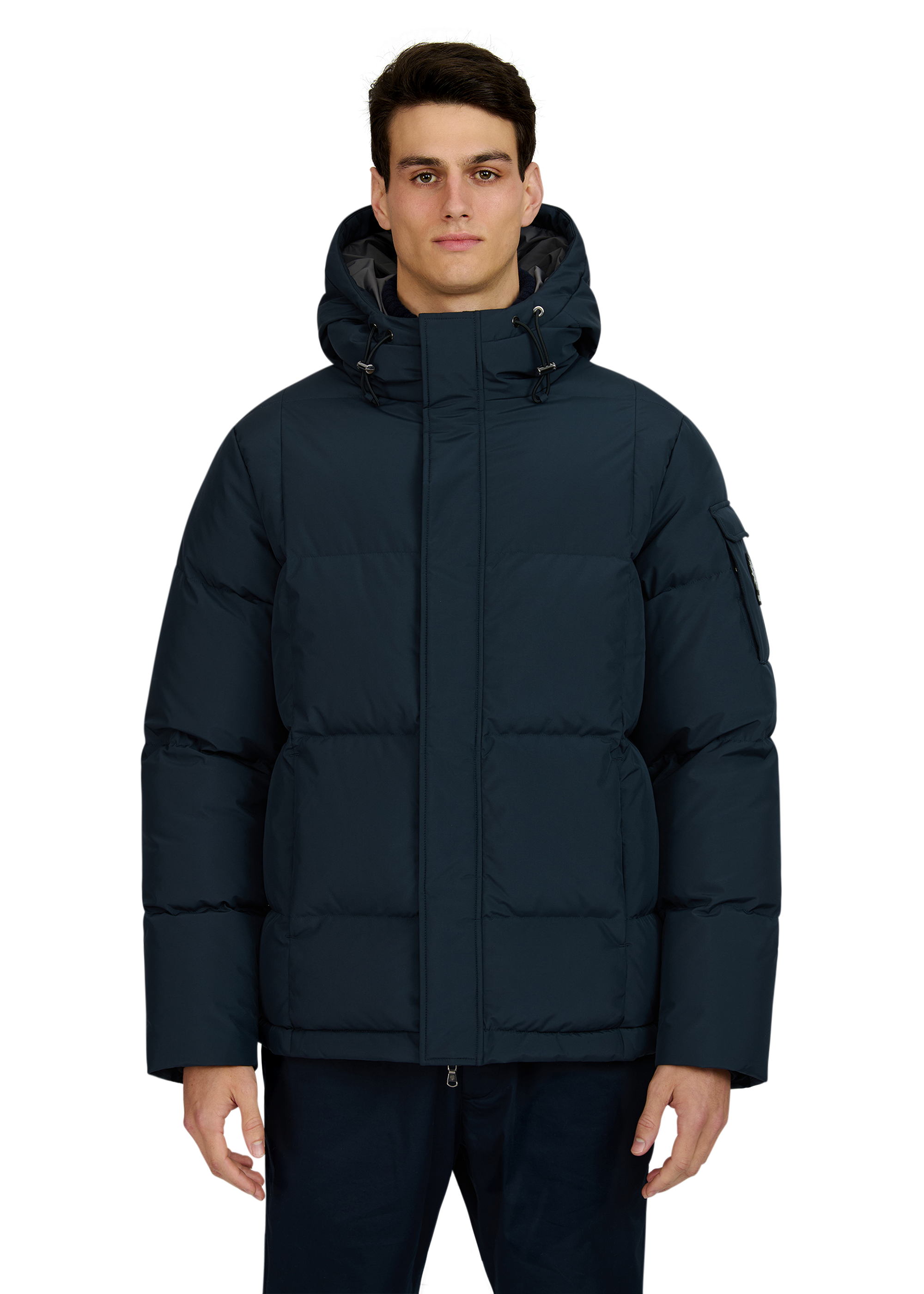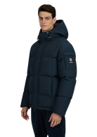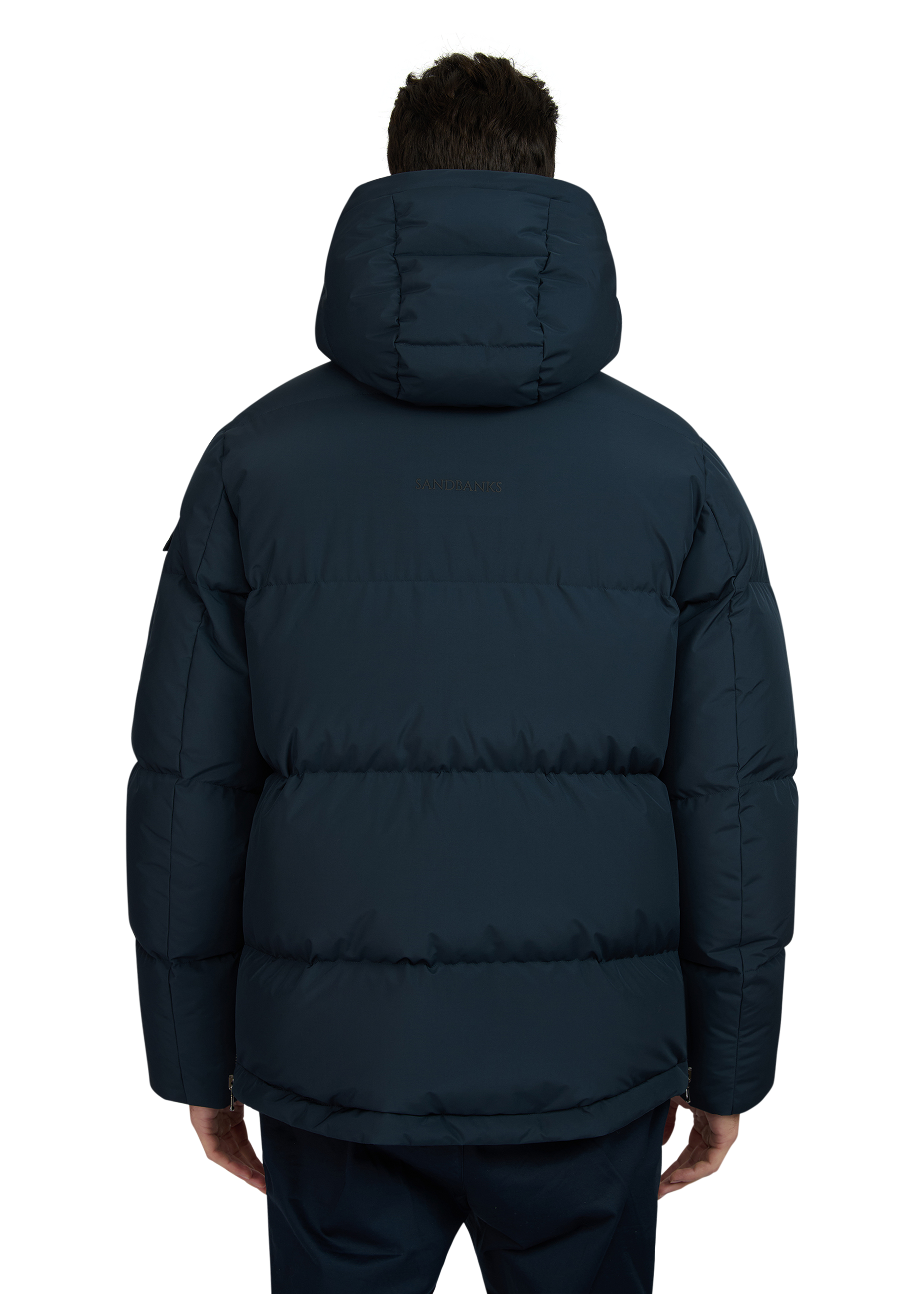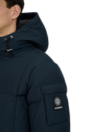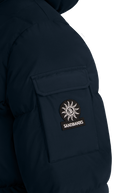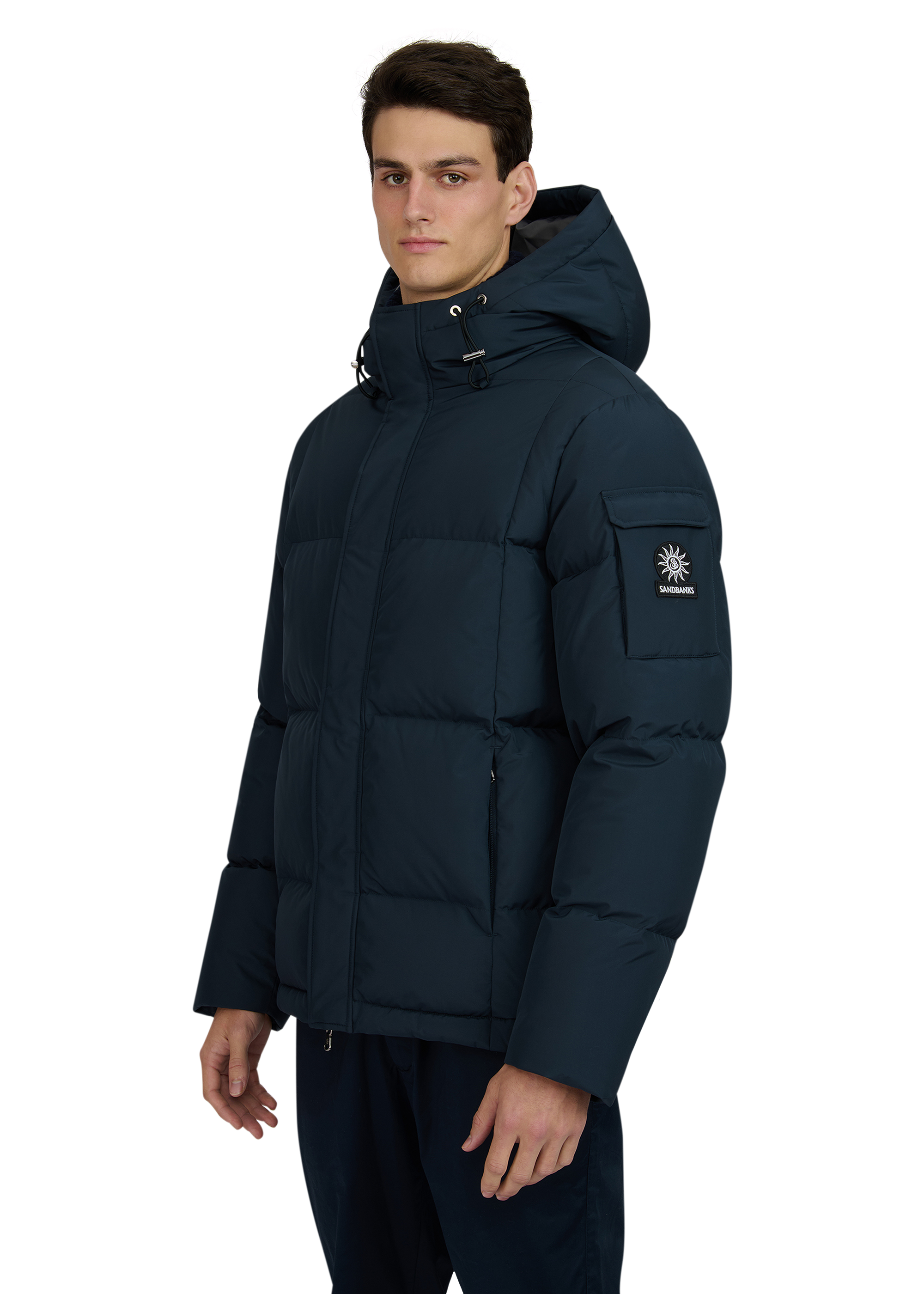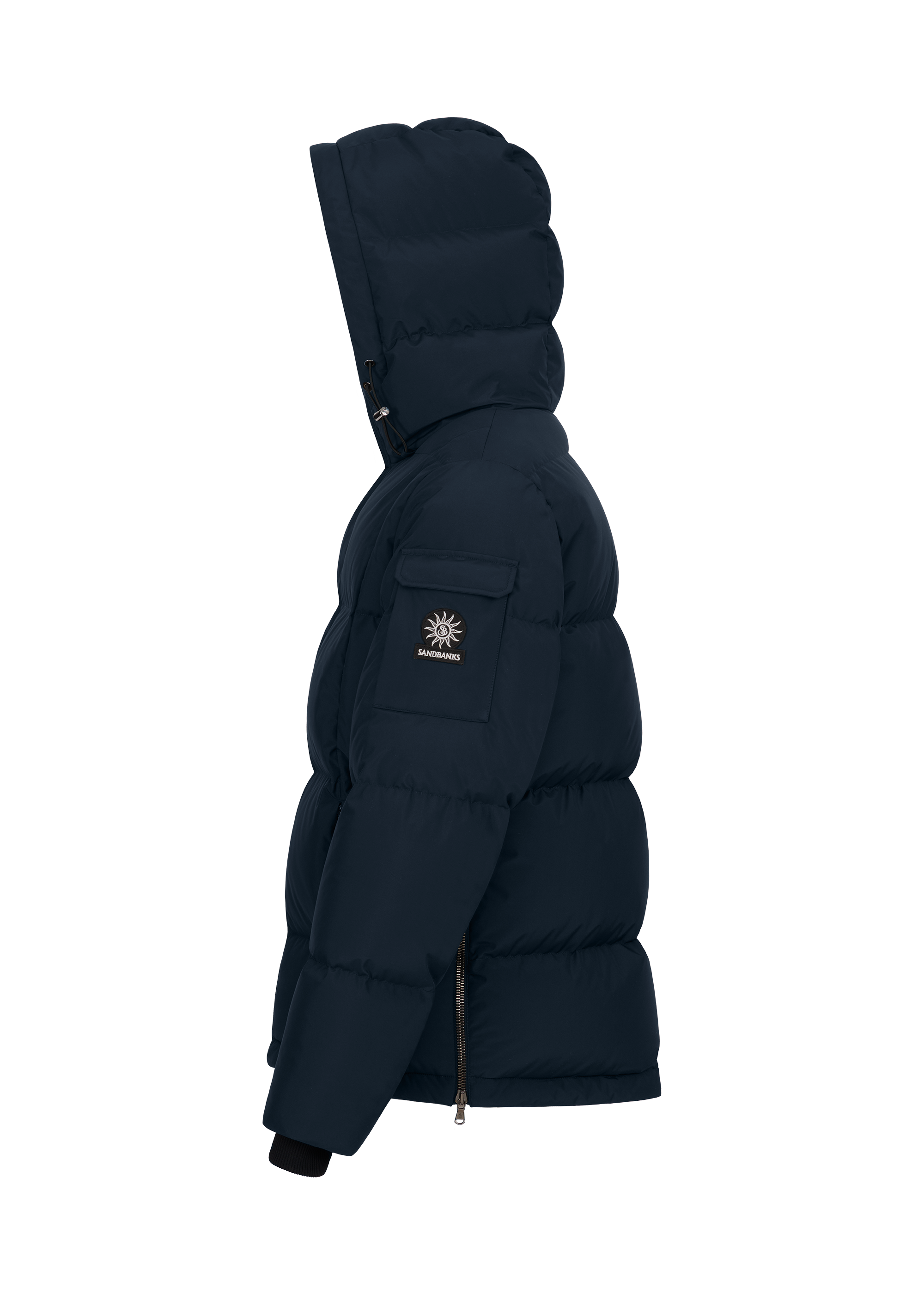 The Sandbanks Alpha Puffer Jacket in navy. A modern take on the classic puffer, designed with wide baffles to provide elevated warmth and a streamlined silhouette. Features include a sleeve pocket detailed with an embroidered Sandbanks badge, an integrated hood with cord adjusters, and concealed zip pockets lined with Polartec® fleece for superior comfort and protection.