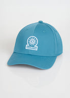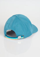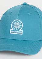 Sandbanks Badge Logo strap-back cap in teal made from 100% recycled polyester and features white Sandbanks embroidered logo, knitted tri-colour rear strap and laser engraved SB logo fastener in gun metal.