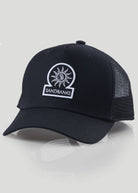 Sandbanks Badge Logo mesh back cap in black made from 100% organic cotton featuring white embroidered badge logo.