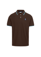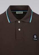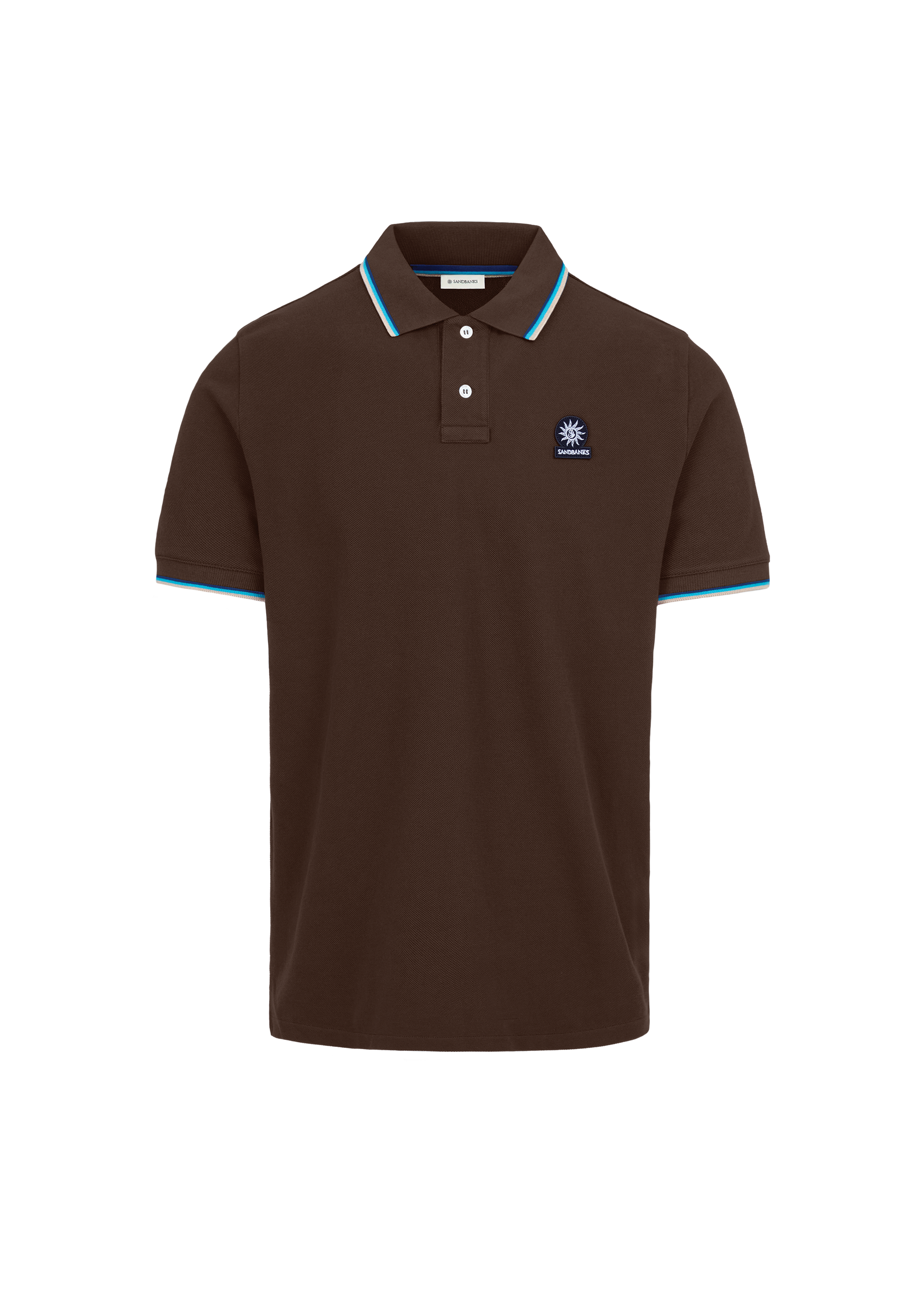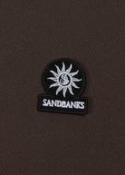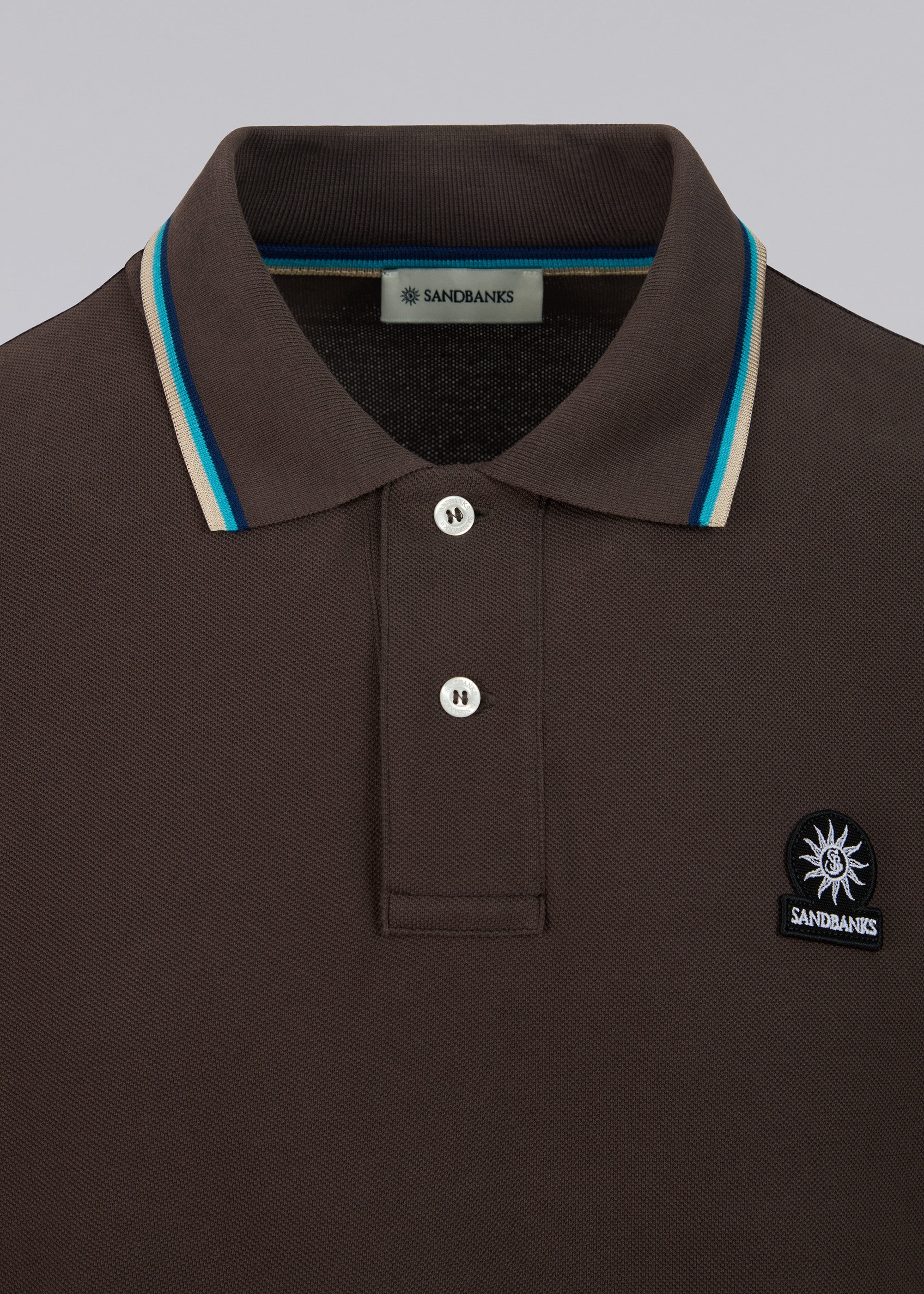 Sandbanks men's badge logo polo shirt in brown, made from 100% organic cotton. This classic fitting 2 button polo shirt features an embroidered badge logo on the chest, tri-colour tipped ribbed collar, cuff and back neck binding.
