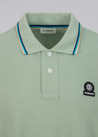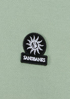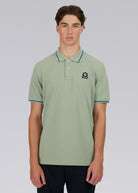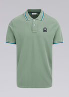 Sandbanks men's badge logo polo shirt in sage, made from 100% organic cotton. This classic fitting 2 button polo shirt features an embroidered badge logo on the chest, tri-colour tipped ribbed collar, cuff and back neck binding.