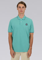 Sandbanks men's badge logo polo shirt in turquoise, made from 100% organic cotton. This classic fitting 2 button polo shirt features an embroidered badge logo on the chest, tri-colour tipped ribbed collar, cuff and back neck binding.