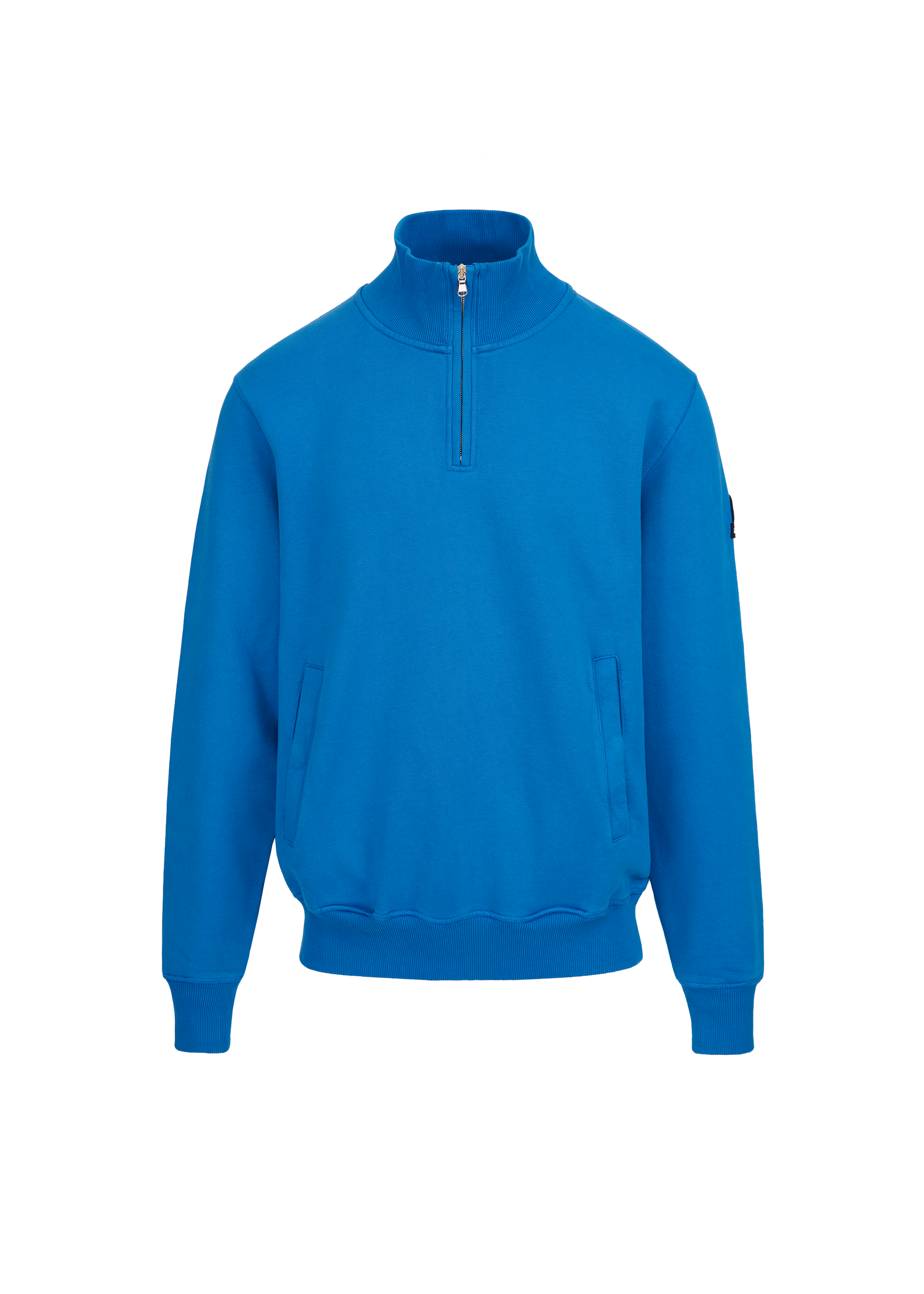Sandbanks badge logo quarter zip sweatshirt in cobalt blue, made from a 400gsm diagonal knitted 100% BCI cotton fabric that features a slight brushed back for a superior soft feeling and warmth, whilst remaining breathable. This quarter zip sweatshirt features a Lampo metal zip in silver with a ribbed neck.