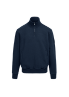 Sandbanks badge logo quarter zip sweatshirt in navy, made from a 400gsm diagonal knitted 100% BCI cotton fabric that features a slight brushed back for a superior soft feeling and warmth, whilst remaining breathable. This quarter zip sweatshirt features a Lampo metal zip in silver with a ribbed neck.