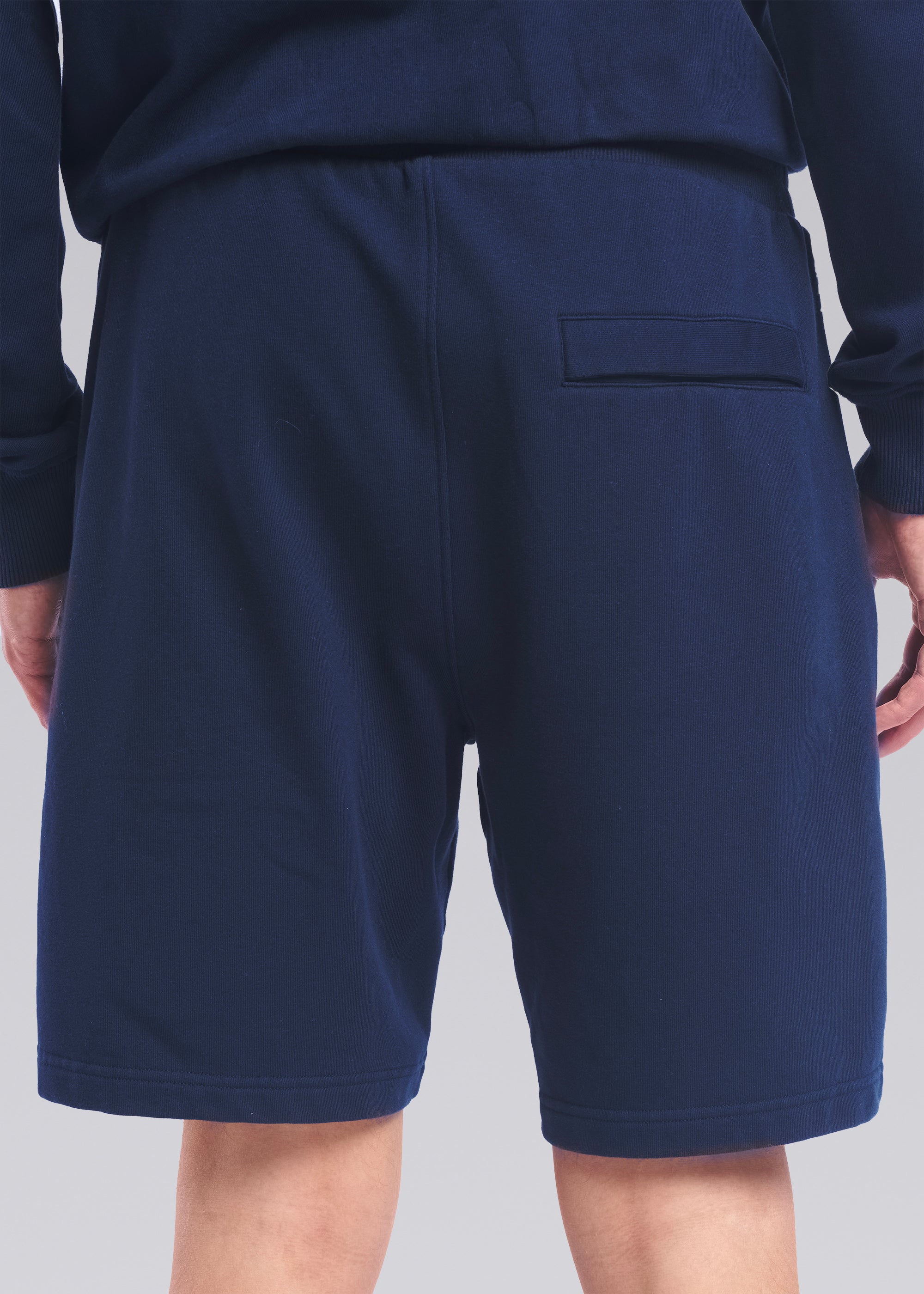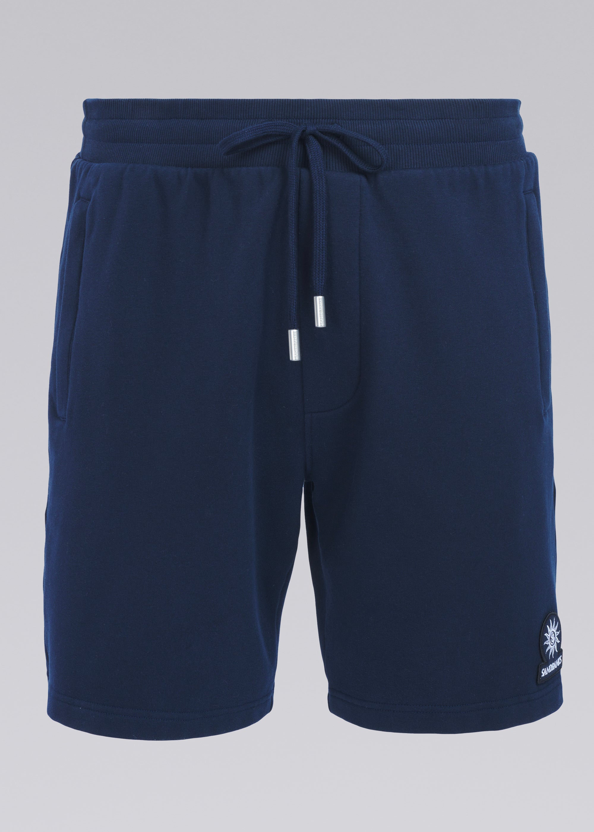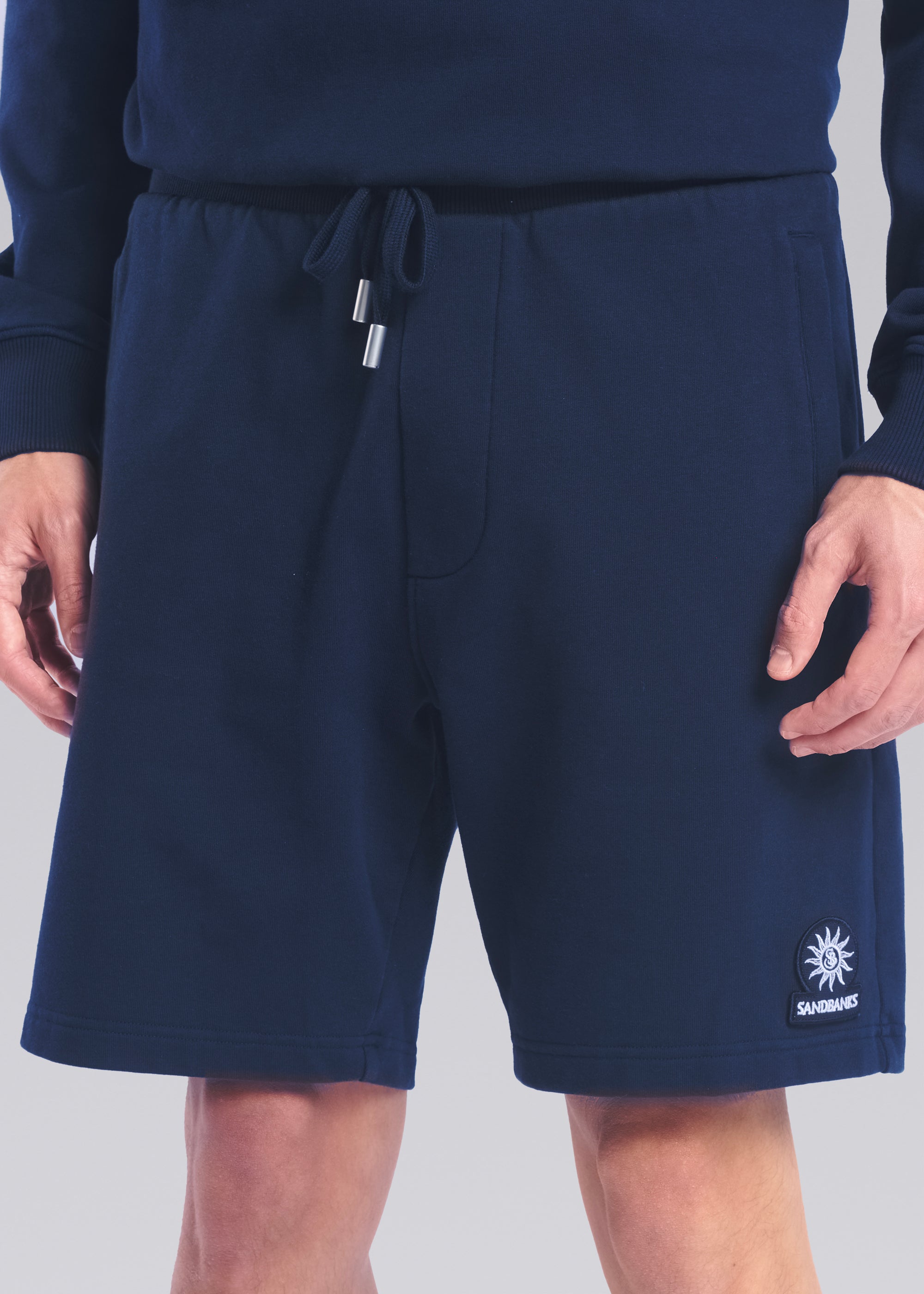 Our new and improved men's Sandbanks badge logo sweat shorts in navy. This garment has been upgraded with a 400gsm diagonal weave knitted fabric that features a slight brushed back for a superior soft feeling, whilst remaining breathable. Made from a 95% cotton 5% elastane for improved feel, shape retention, finished with an embroidered badge logo, and side zip pockets with engraved pullers.