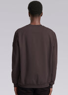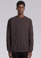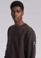 Our new and improved men's Sandbanks badge logo sweatshirt in brown. This garment has been upgraded with a 400gsm diagonal knitted fabric that features a slight brushed back for a superior soft feeling and warmth, whilst remaining breathable. Made from 100% BCI Cotton with a sleeve embroidered badge logo and cover stitch details.