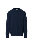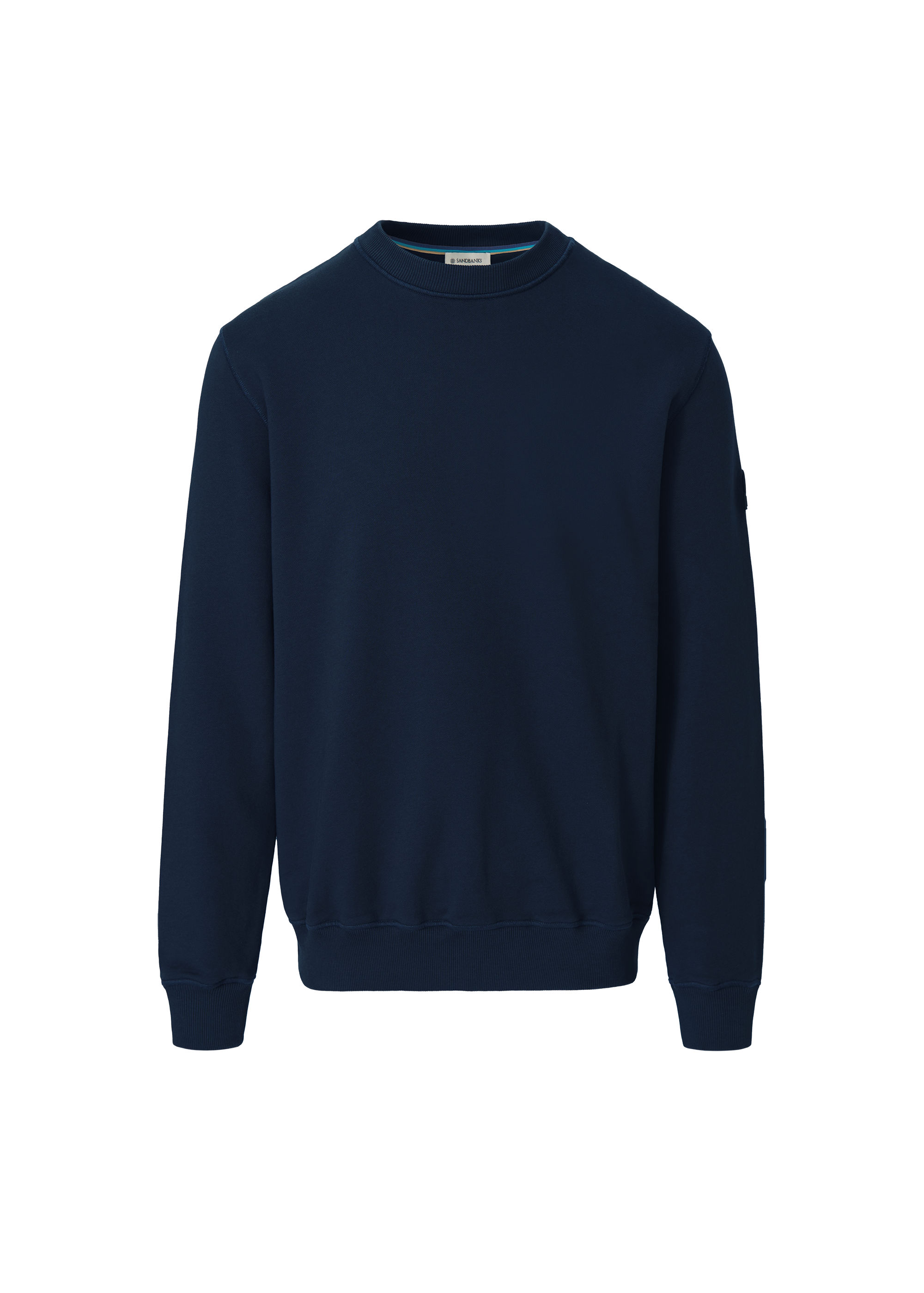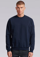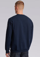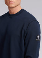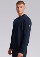 Our new and improved men's Sandbanks badge logo sweatshirt in navy. This garment has been upgraded with a 380gsm diagonal knitted fabric that features a slight brushed back for a superior soft feeling and warmth, whilst remaining breathable. Made from a 95% cotton 5% elastane for improved feel, shape retention and finished with a sleeve embroidered badge logo and cover stitch details.