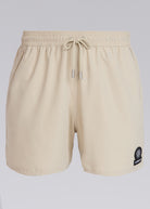 The Sandbanks badge logo swim shorts in stone, made from a luxurious emerised fabric using 100% recycled polyester yarns and features an embroidered badge logo, elasticated waistband with drawstring cords, brushed gun metal cord ends with laser engraved Sandbanks logo, side pockets and rear zip pocket with laser engraved SB zip puller.