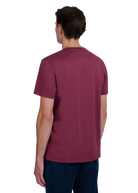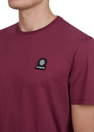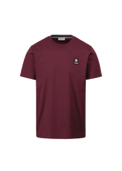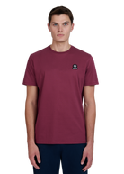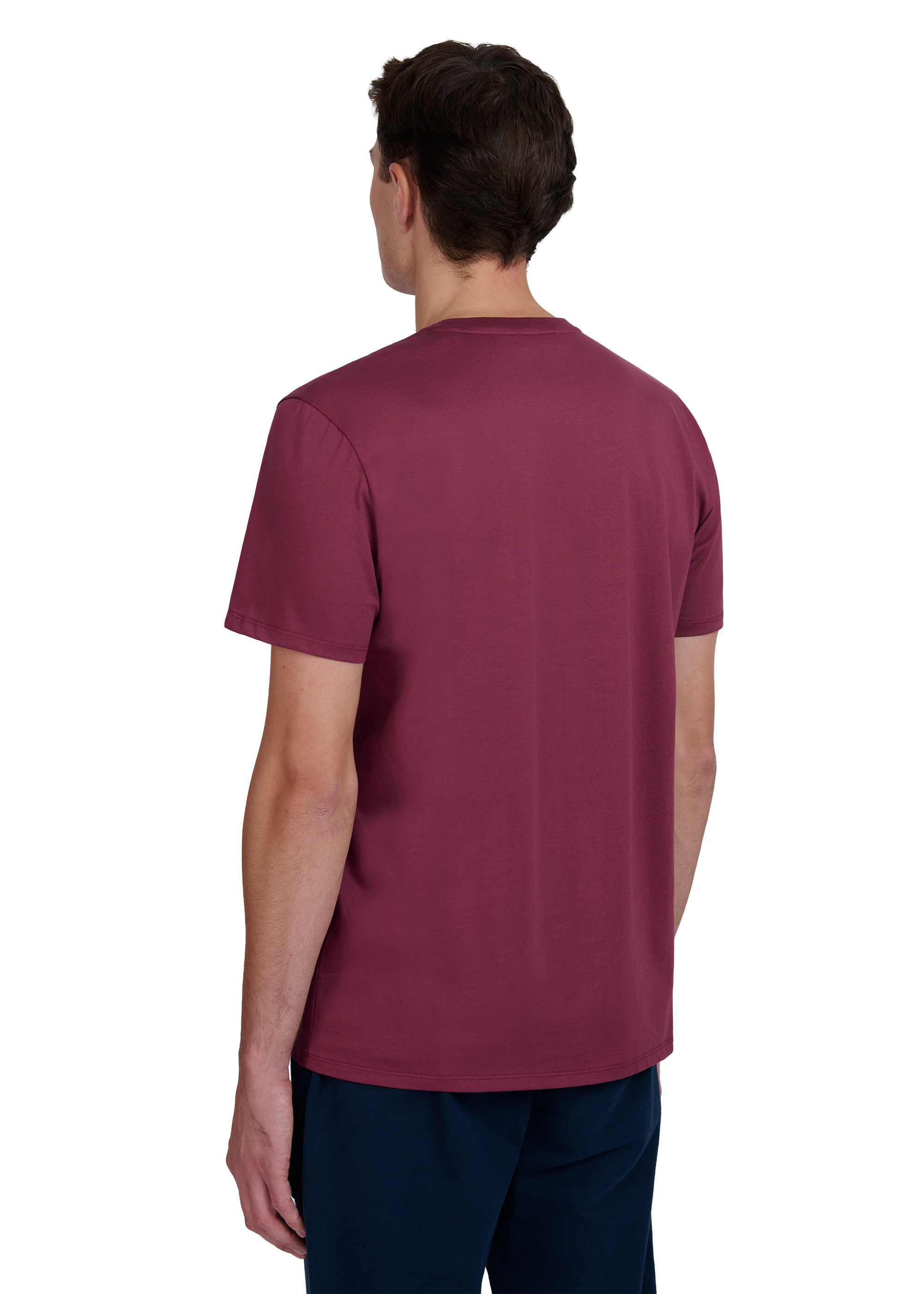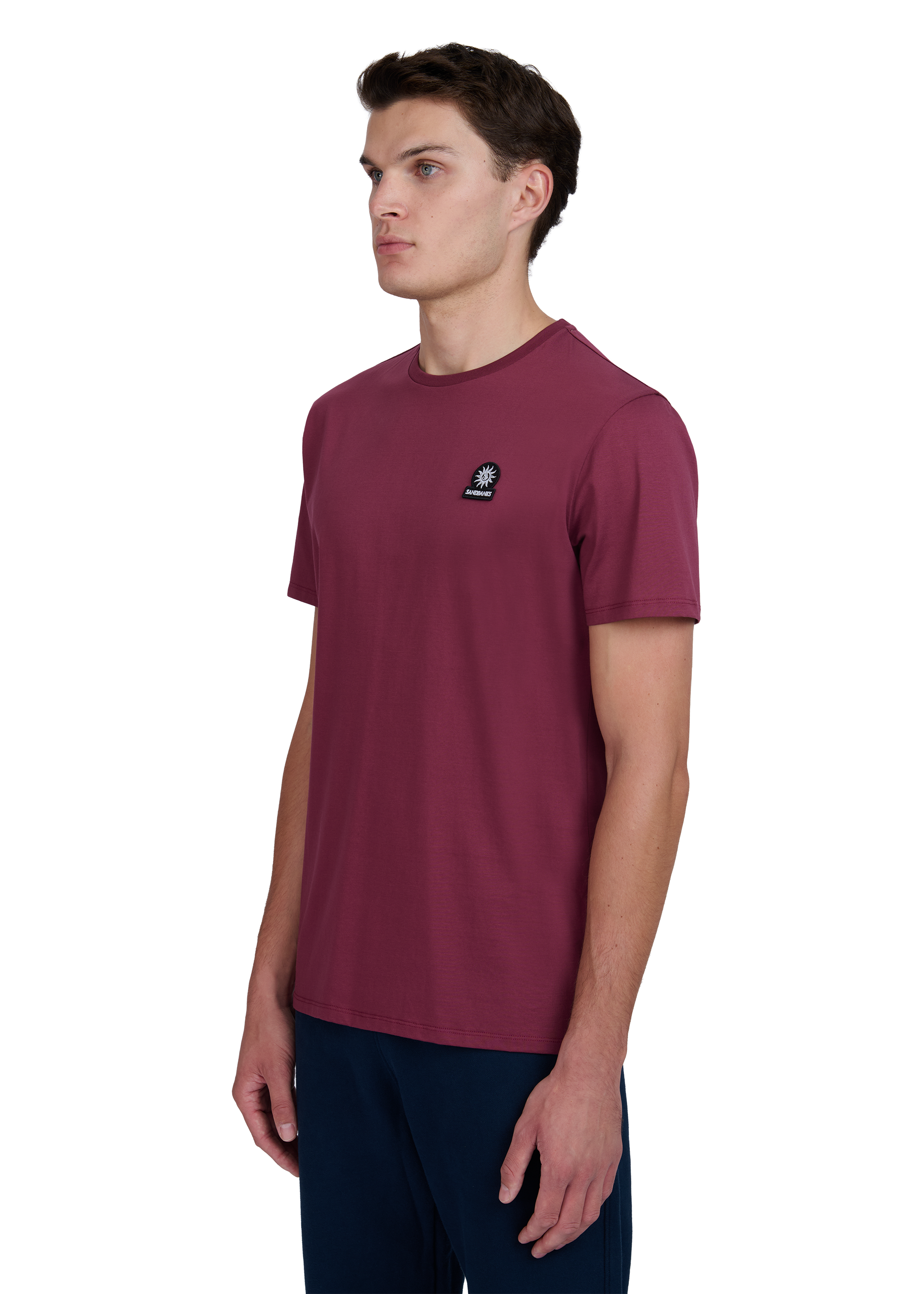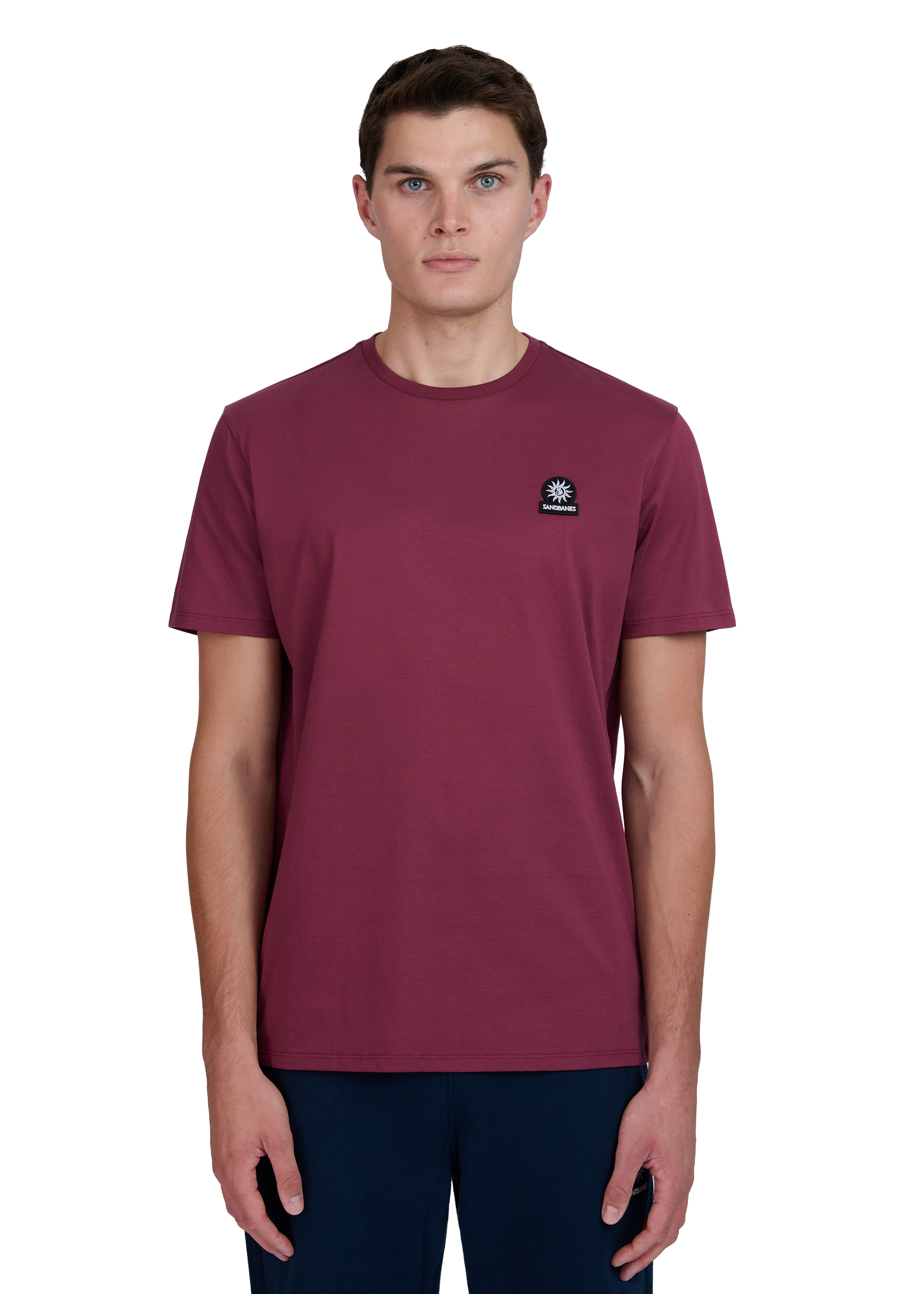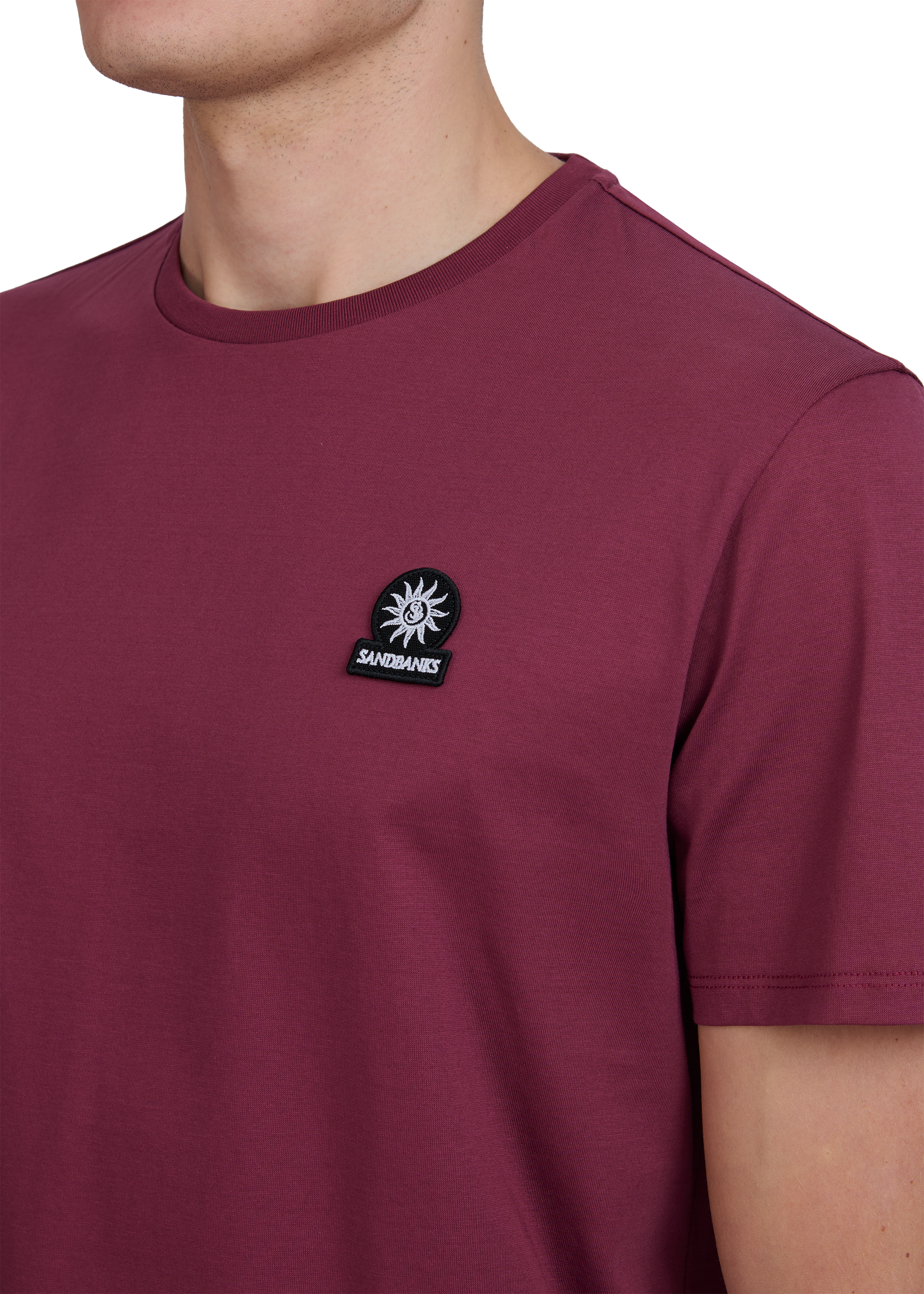 Sandbanks men's badge logo t-shirt in port, made from mercerised cotton for a silky and luxurious feel. This classic fitting crew neck t-shirt features an embroidered badge logo on the chest and tri-colour back neck binding.