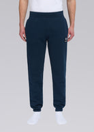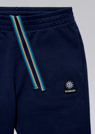 Our men's Sandbanks badge logo track pants in navy is constructed with a 400gsm diagonal knitted fabric that features a slight brushed back for a superior soft feeling and warmth, whilst remaining breathable. Made from 100% BCI Cotton with a embroidered badge logo, and internal tri-colour flat draw cord.