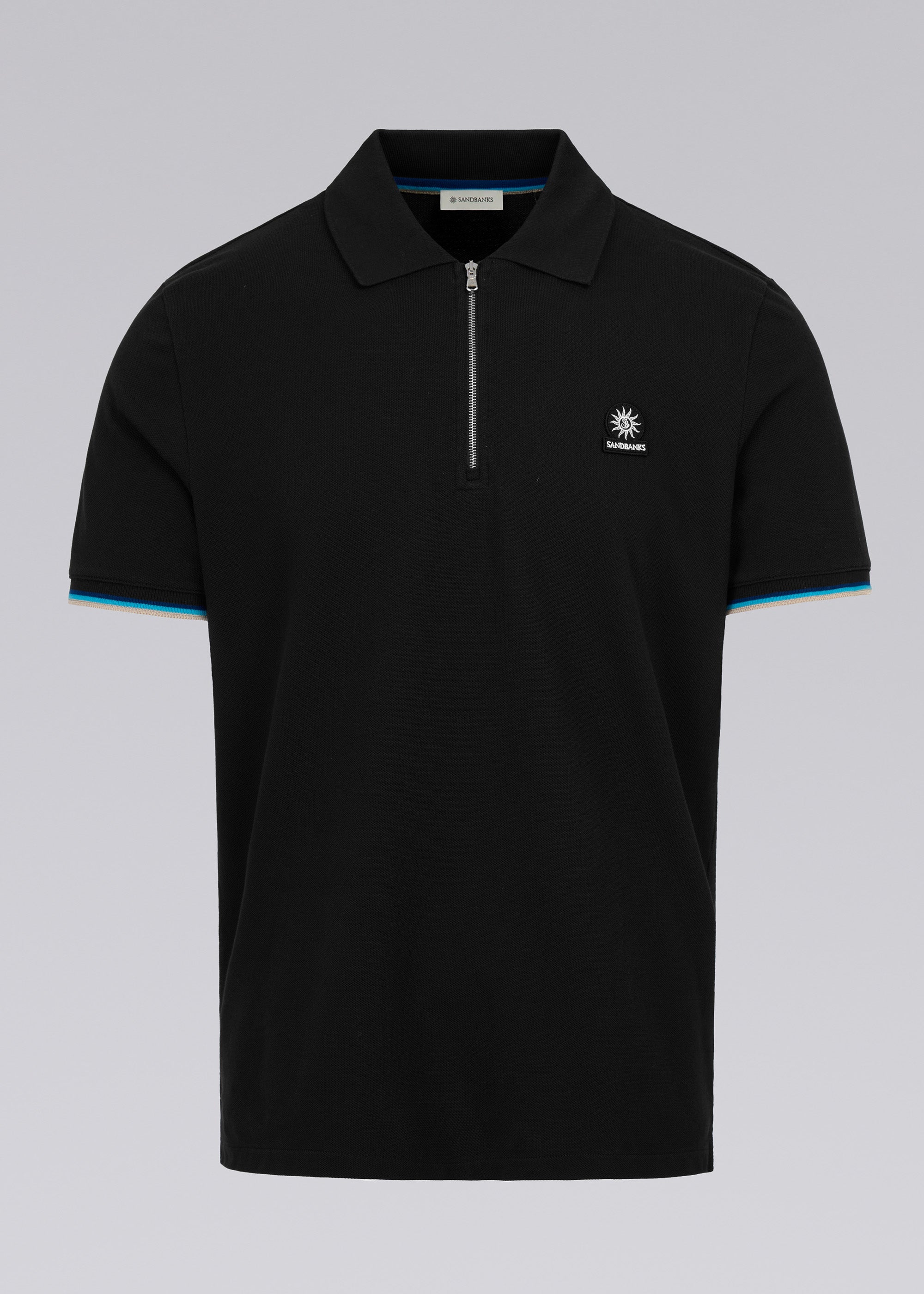Sandbanks men's badge logo zip polo shirt in black, made from 100% organic cotton. This classic fitting zip polo shirt features an embroidered badge logo on the chest, tri-colour tipped knitted cuff and back neck binding.
