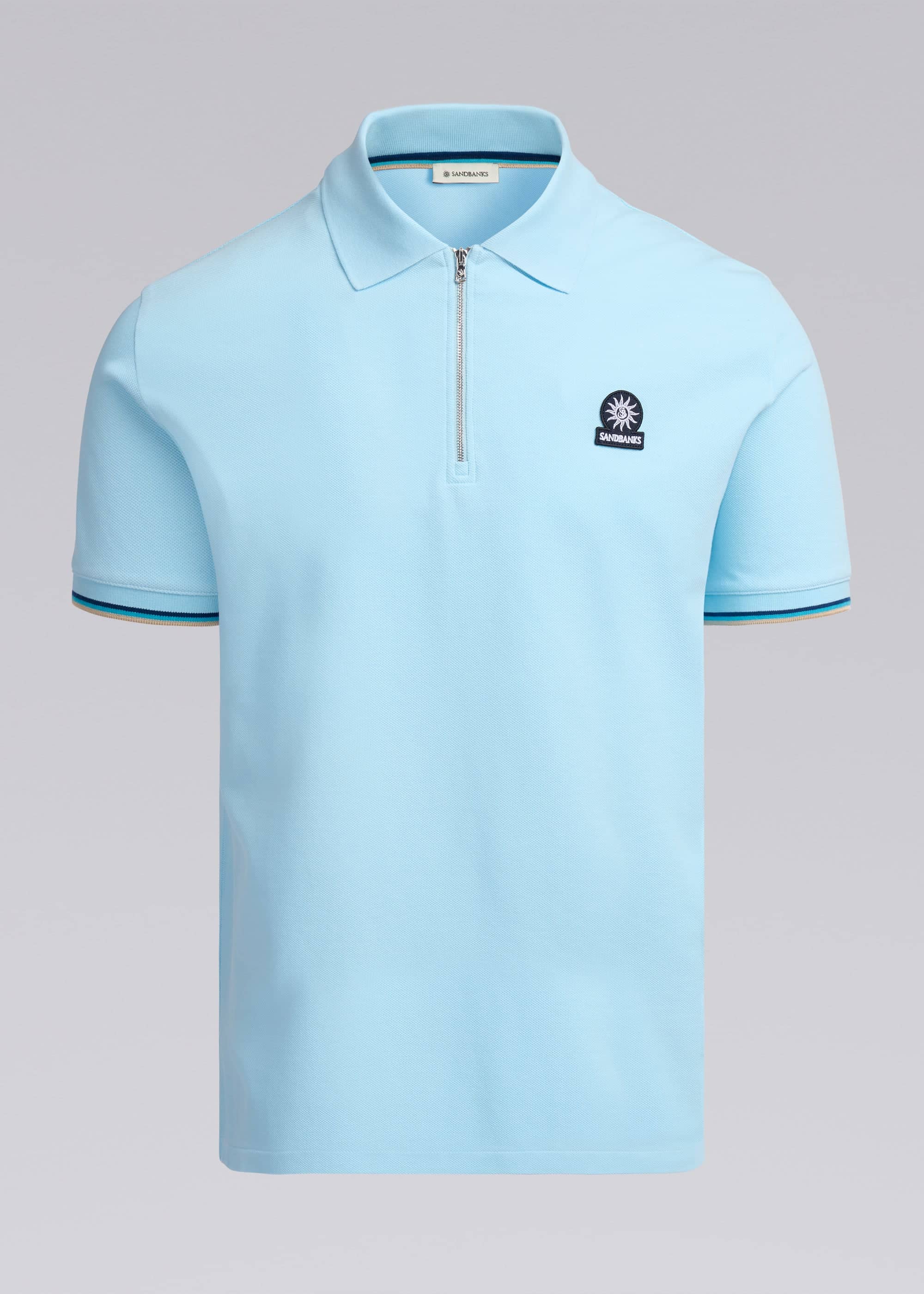Sandbanks men's badge logo zip polo shirt in crystal blue, made from 100% organic cotton. This classic fitting zip polo shirt features an embroidered badge logo on the chest, tri-colour tipped knitted cuff and back neck binding.