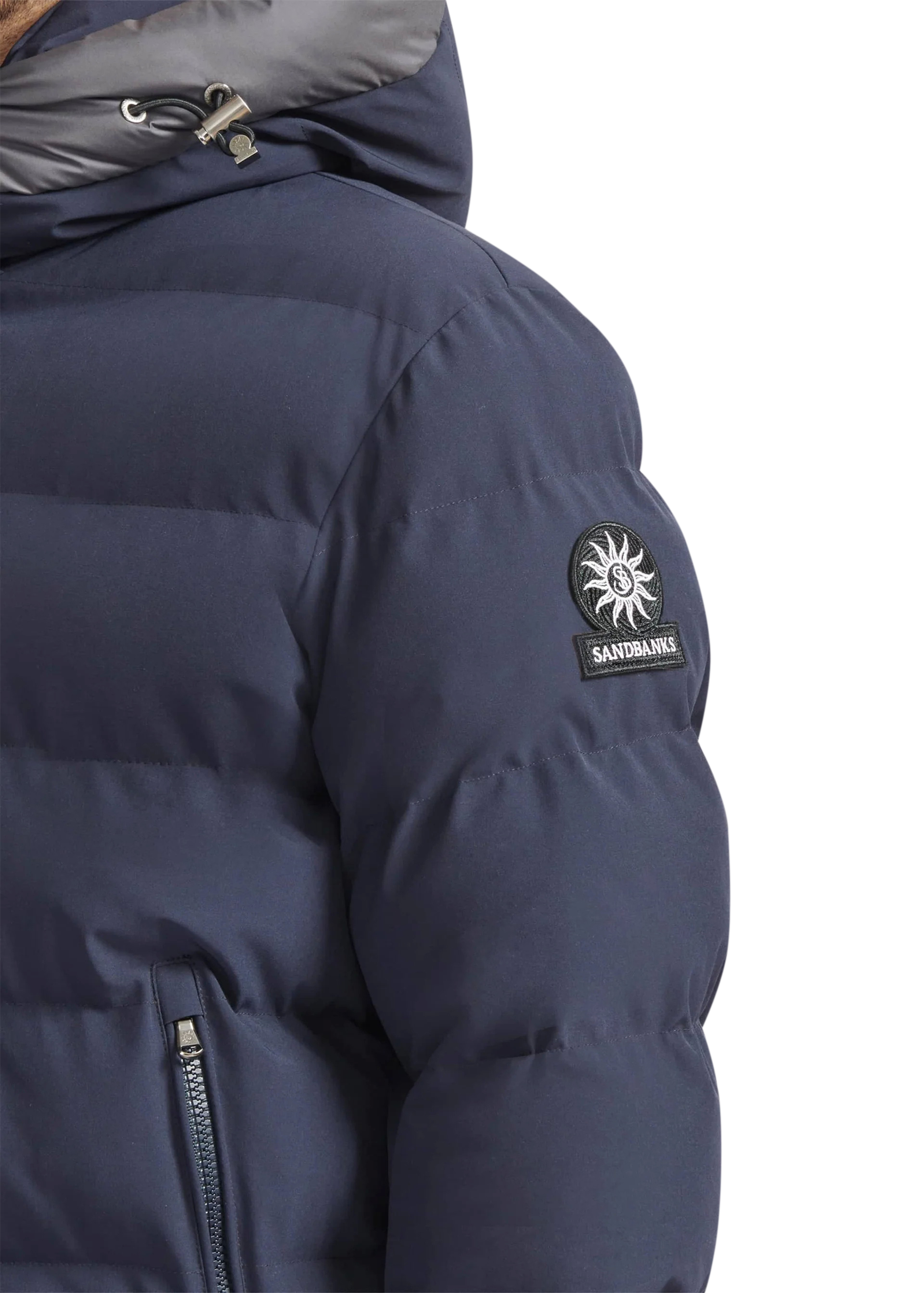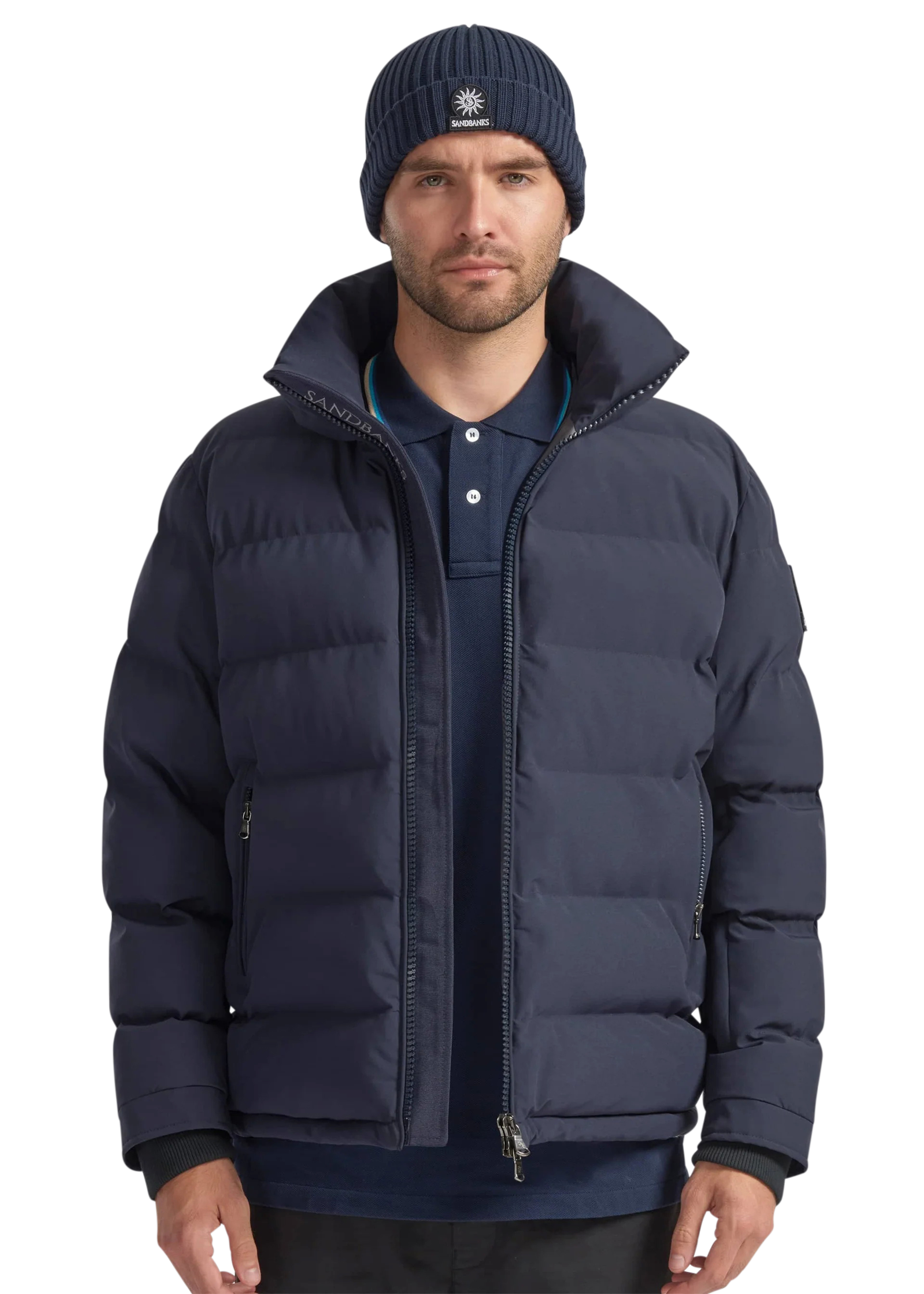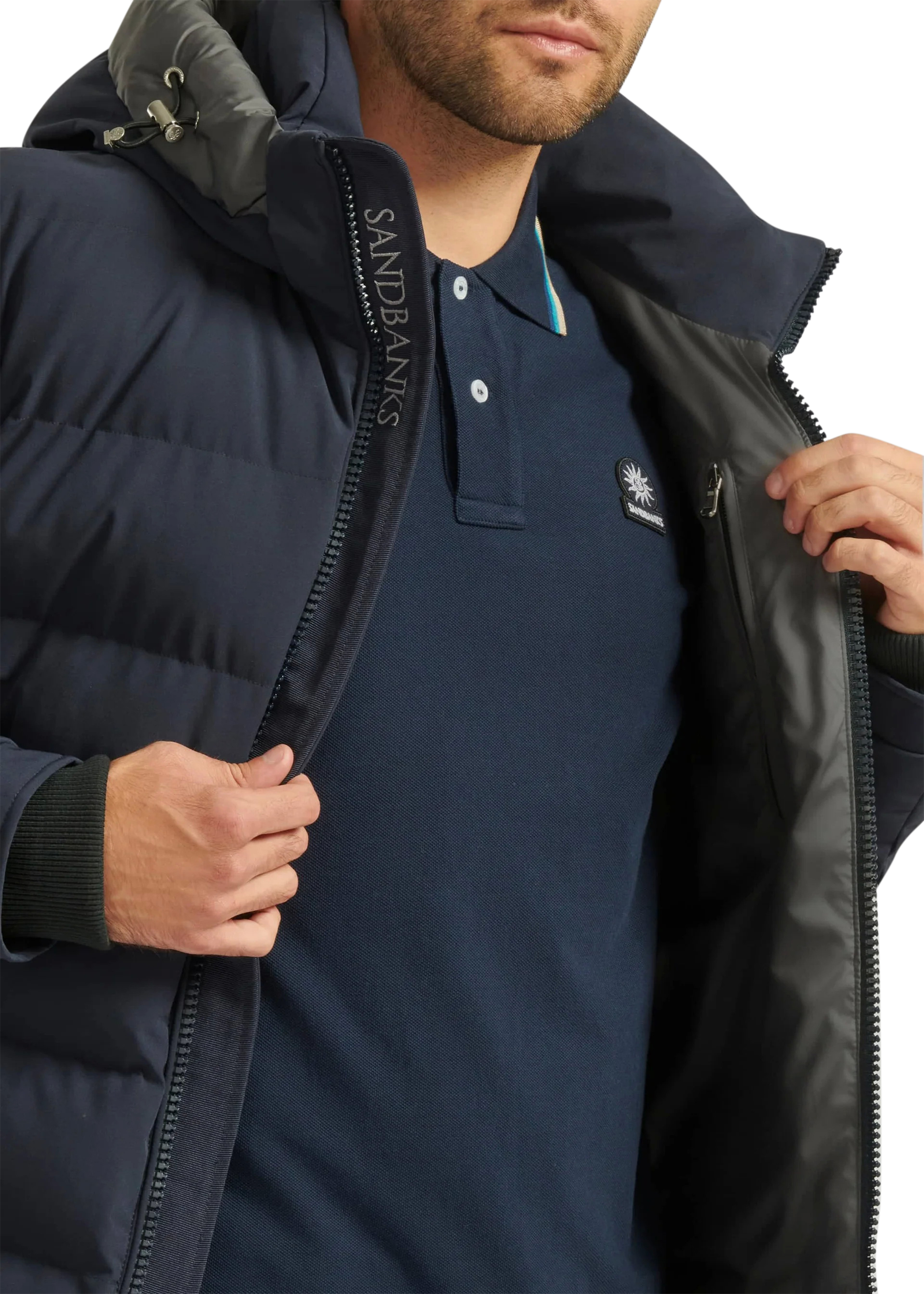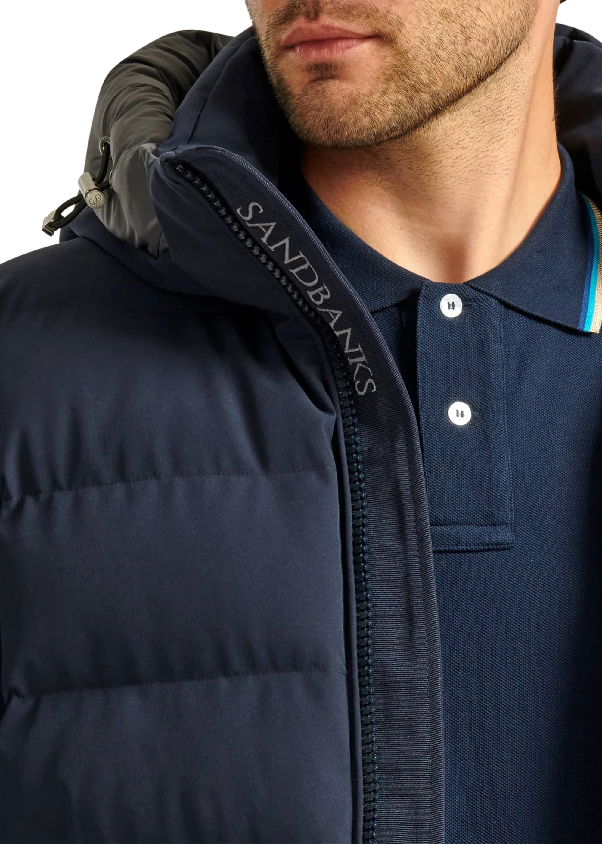 Sandbanks Banks puffer jacket is made almost entirely from recycled plastic bottles. With a navy shell fabric, this has high thermal retention and features a Sandbanks embroidered logo badges, large lower pocket/chest pocket details and detachable hood.