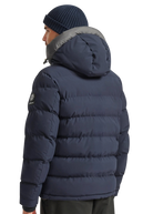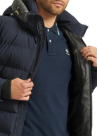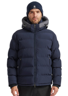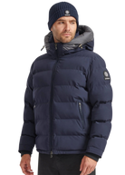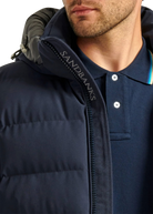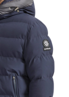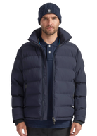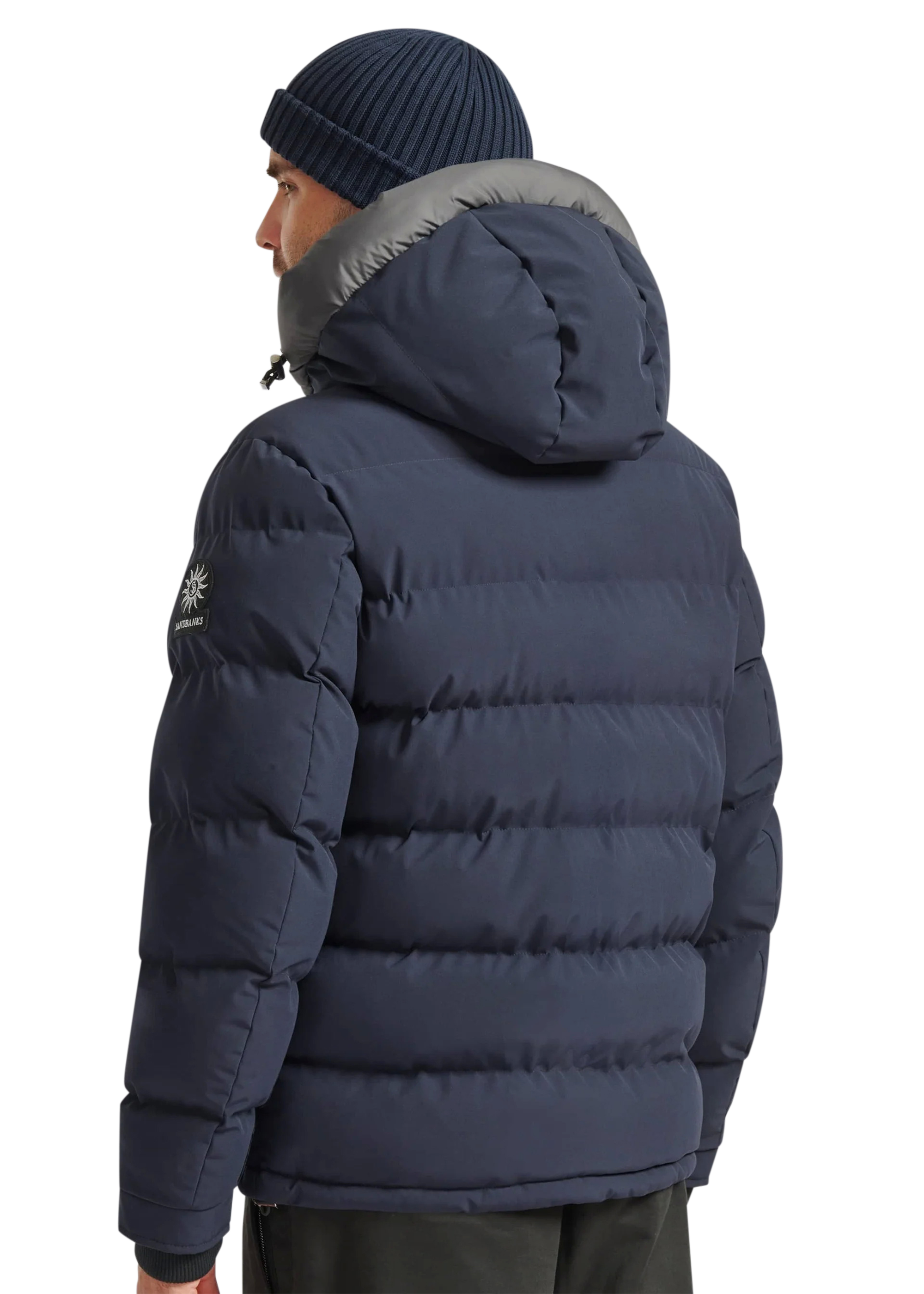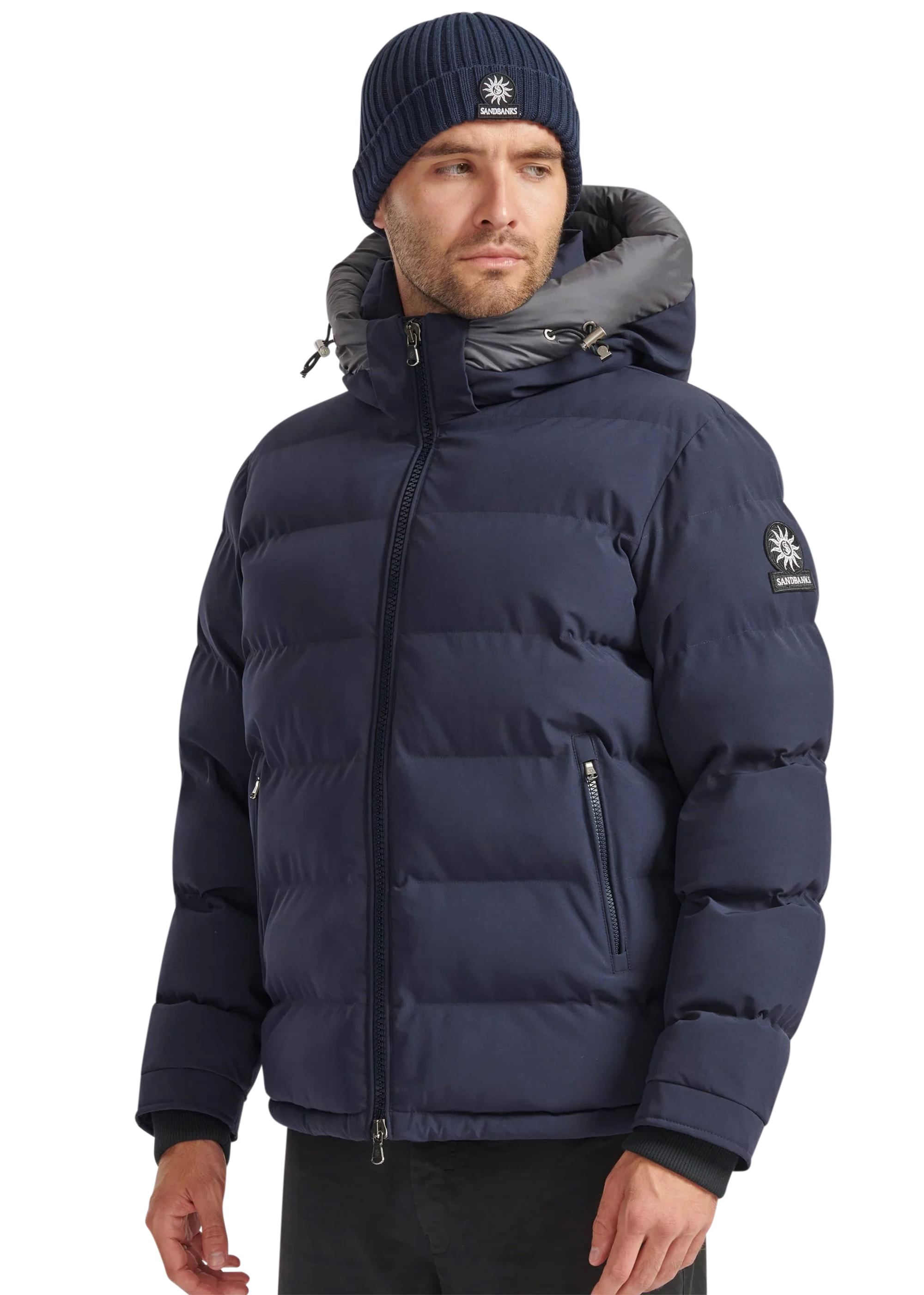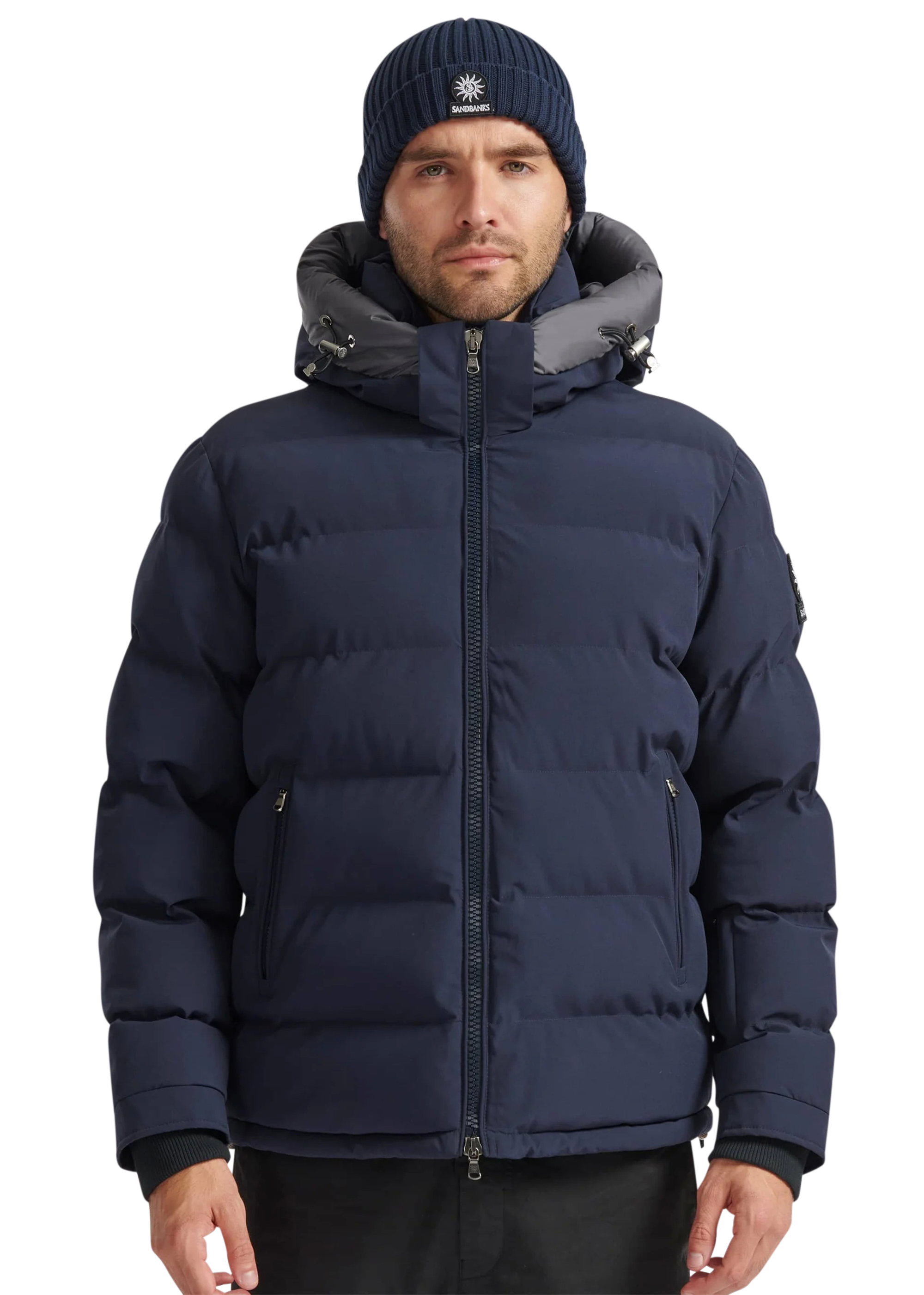 Sandbanks Banks puffer jacket is made almost entirely from recycled plastic bottles. With a navy shell fabric, this has high thermal retention and features a Sandbanks embroidered logo badges, large lower pocket/chest pocket details and detachable hood.