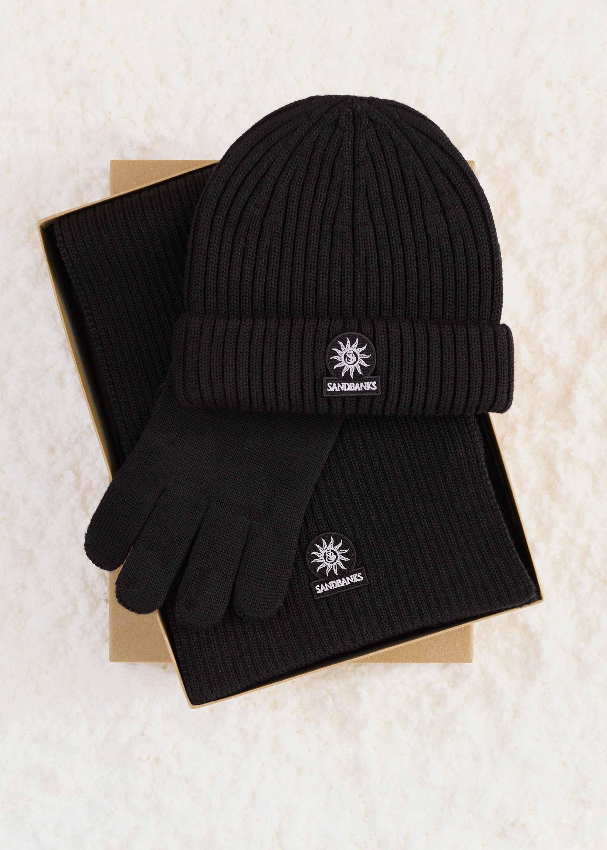 Sandbanks knitted accessories box set in black, including our badge logo beanie, scarf and gloves. These signature knitted accessories are made from a merino wool blend for luxury layering, and feature an embroidered badge logo.