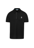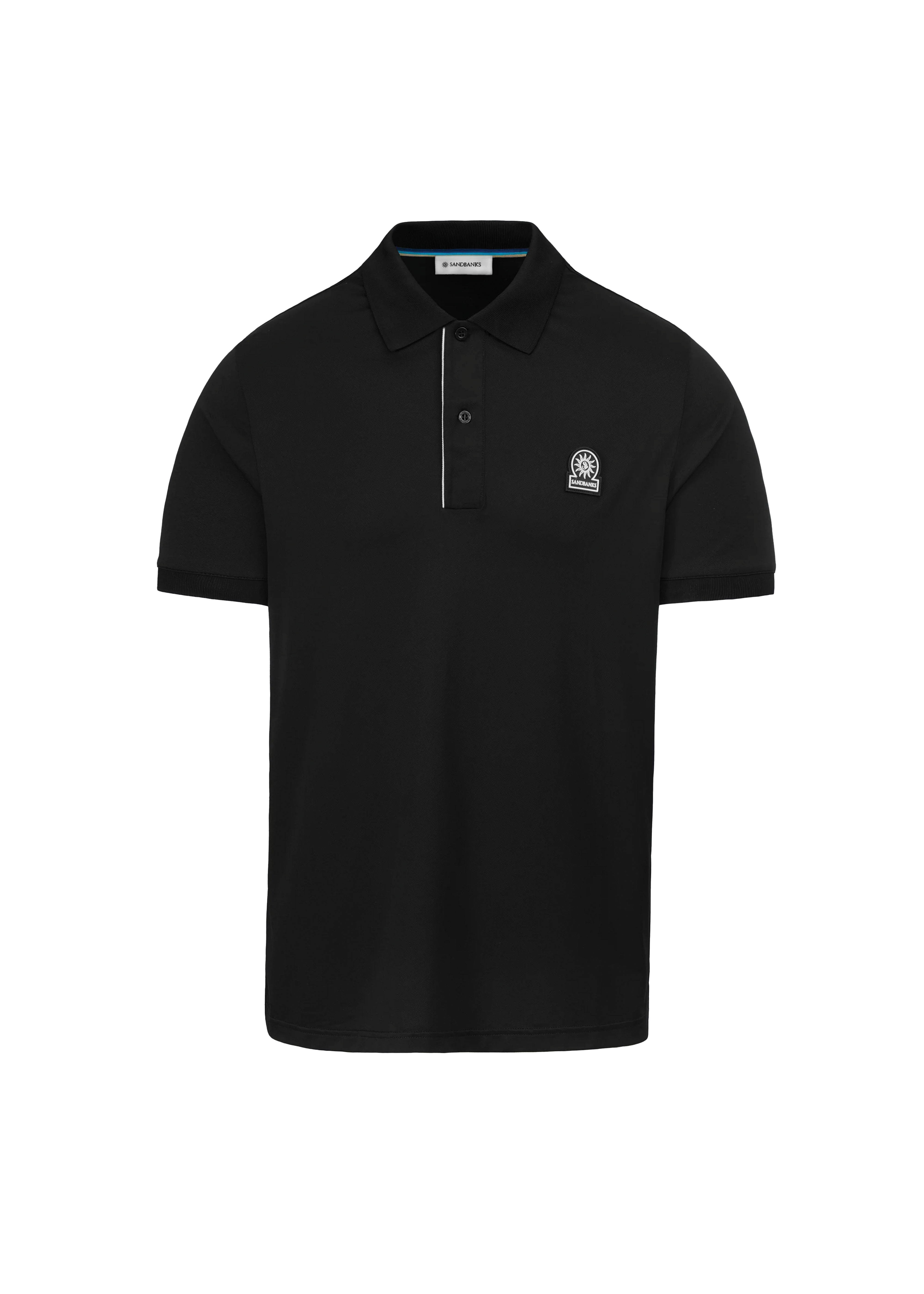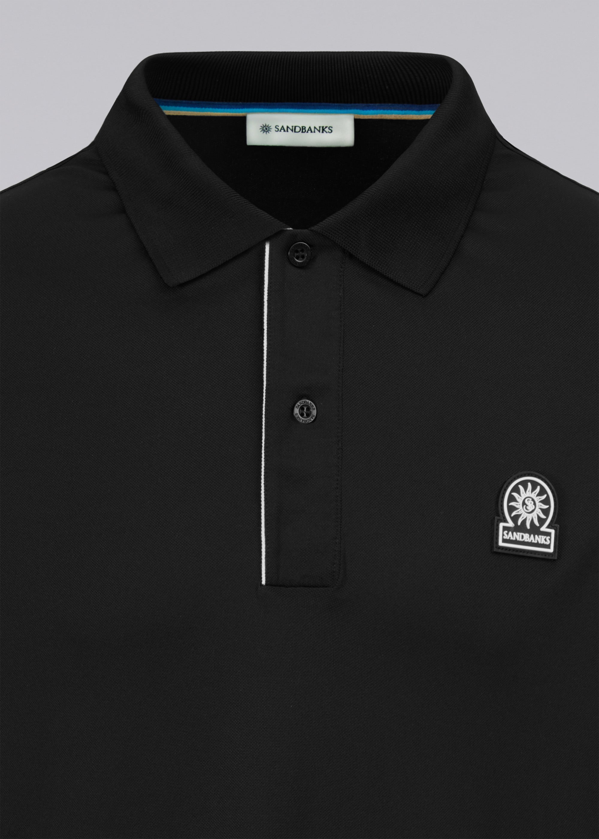 Sandbanks men's contrast placket polo shirt in black, made from Q-NOVA® recycled polyamide; a breathable, moisture wicking and temperature regulating technical fabric. This classic fitting polo shirt has a statement contrast white placket, tonal Sandbanks rubber badge and tri-colour back neck binding.