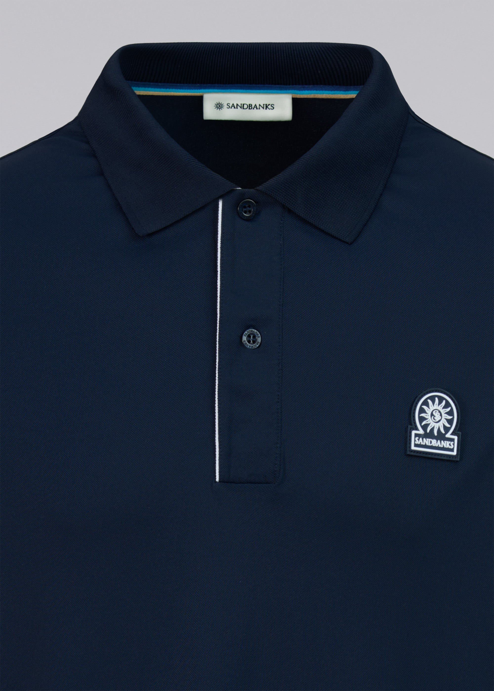 Sandbanks men's contrast placket polo shirt in navy, made from Q-NOVA® recycled polyamide; a breathable, moisture wicking and temperature regulating technical fabric. This classic fitting polo shirt has a statement contrast white placket, tonal Sandbanks rubber badge and tri-colour back neck binding.