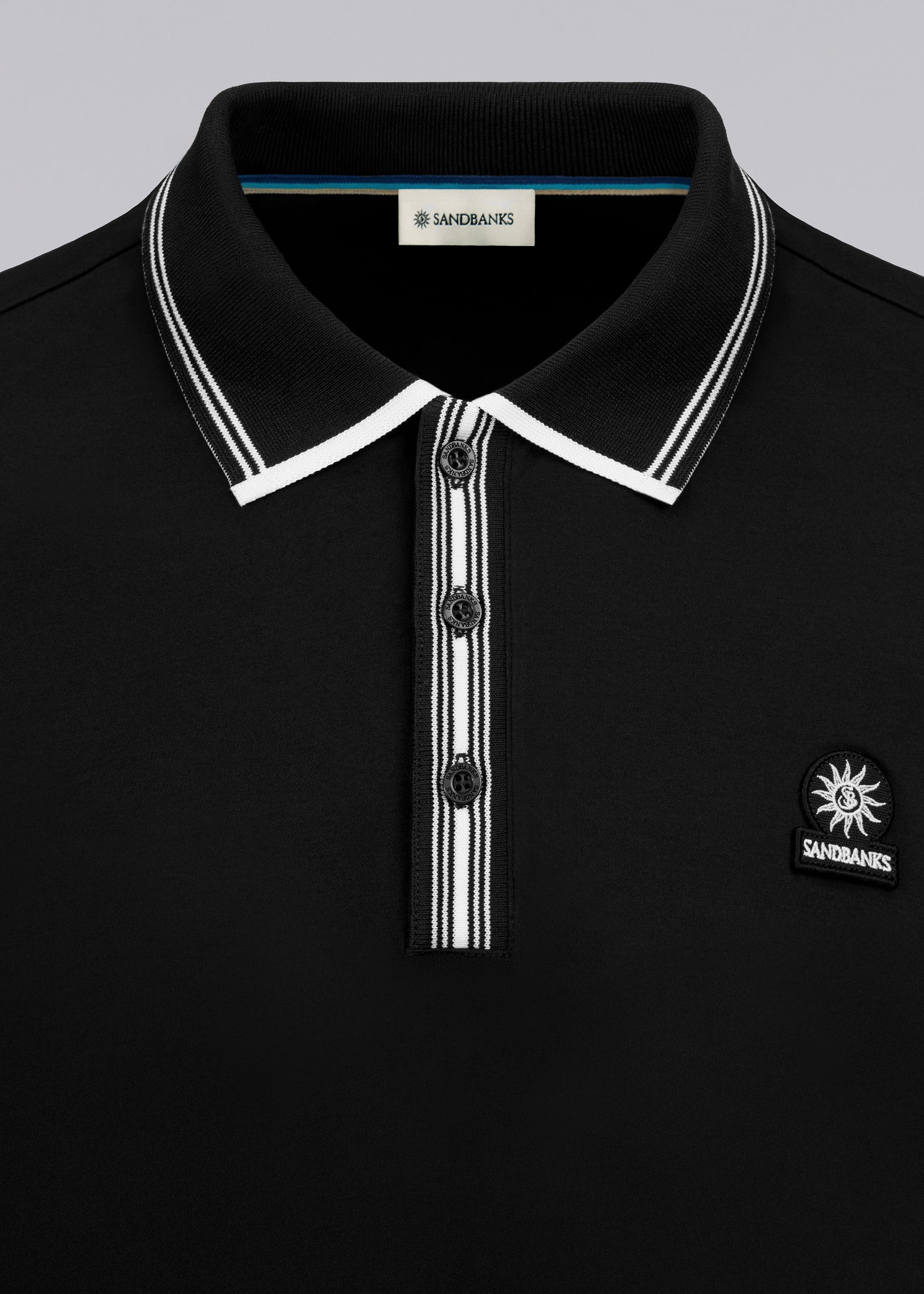 Sandbanks men's contrast stripe polo shirt in black, made from sustainably sourced 100% BCI Cotton. This classic fitting polo shirt features statement contrast stripe collar and placket, Sandbanks embroidered chest badge, and tri-colour back neck binding.