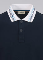 Sandbanks men's embroidered collar pique polo shirt in navy, made from 100% bci cotton. This classic fitting polo shirt features statement white collar with contrast navy and crystal blue wave embroidery, navy engraved rubberised two popper placket, and embroidered badge on the sleeve.