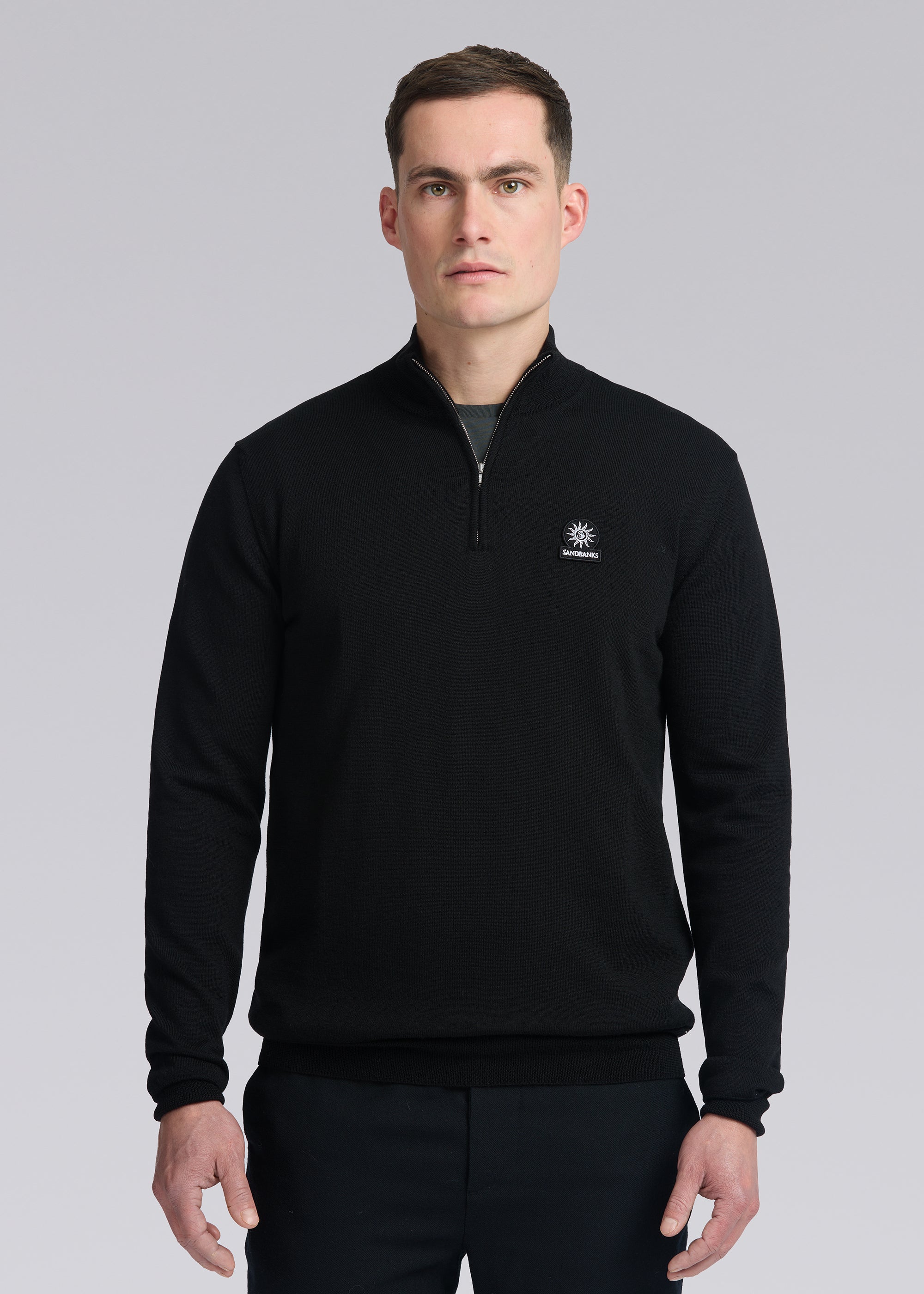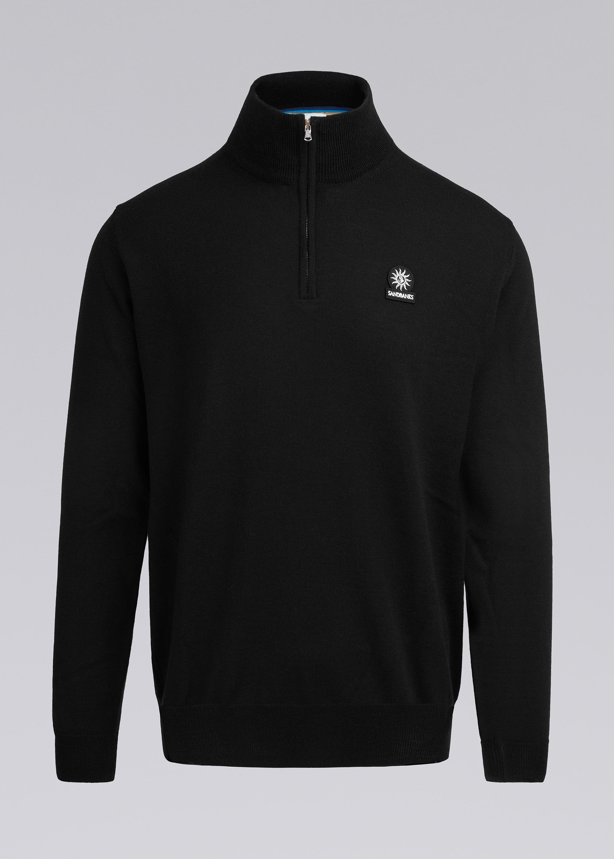 The Sandbanks Merino Wool Quarter Zip Jumper in black is crafted with ultra fine 100% Merino Wool from Italy. It boasts a Sandbanks logo badge embroidery on the chest, a funnel neck design, and a Sandbanks branded Lampo engraved zip.