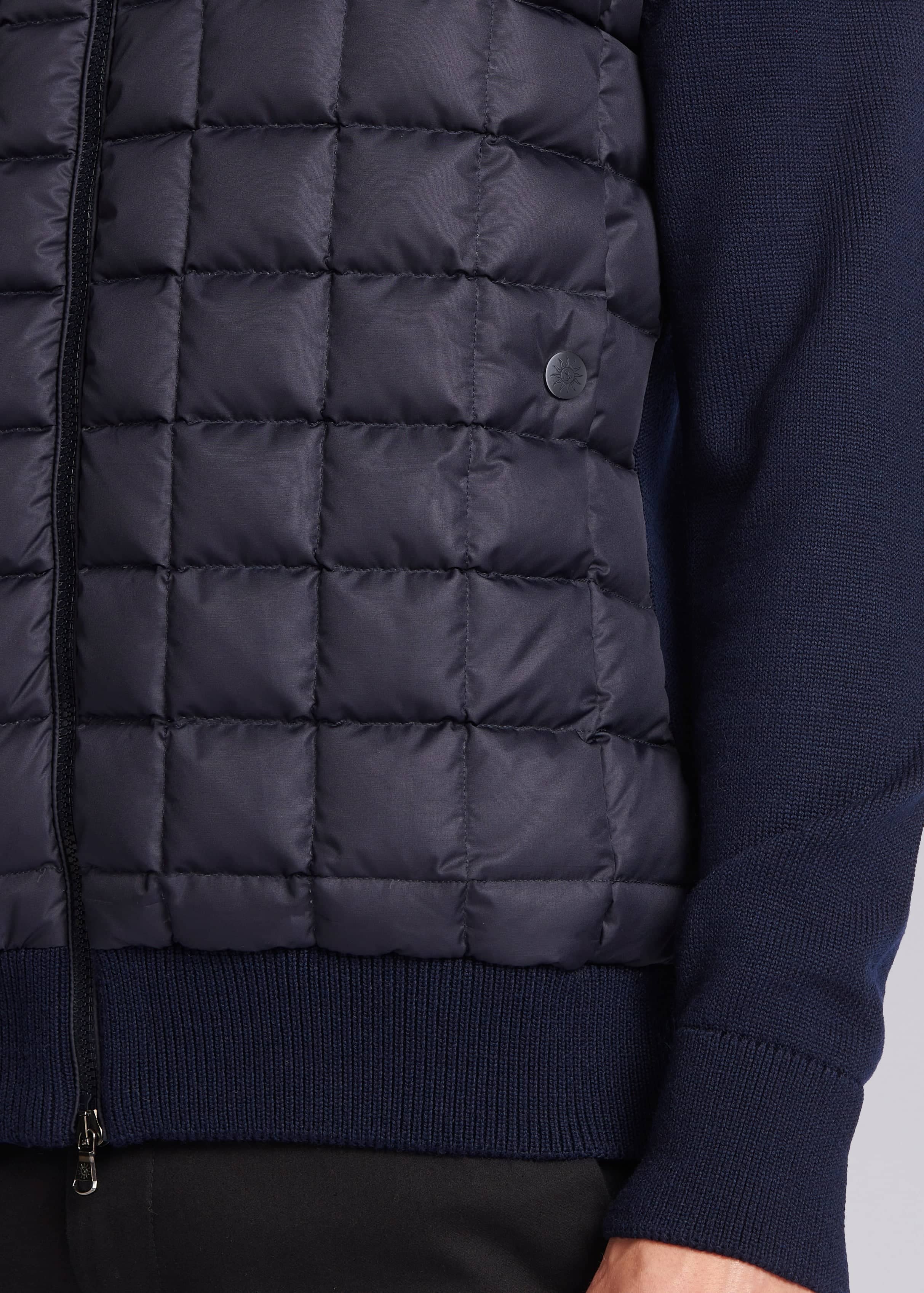 The Sandbanks Hybrid knit zip jacket in navy, a contemporary menswear piece that features a unique square baffle puffer front that is filled with natural recycled down for warmth making this an ideal layering piece or stand alone jacket. The sleeves, funnel neck, waistband and back are made from a Merino wool blend for a luxurious feel. This jacket also benefits from a 2-way Italian Lampo zip, 2 concealed popper close side pockets and finished with a Sandbanks badge on the sleeve.