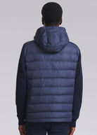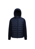 Sandbanks Hooded Hybrid Knit Jacket in navy. This lightweight jacket features a puffer baffle body front, hood and back with knitted 100% bio cotton sleeves and side panels, finished with Lampo zips, Italian components and a Sandbanks embroidered badge.
