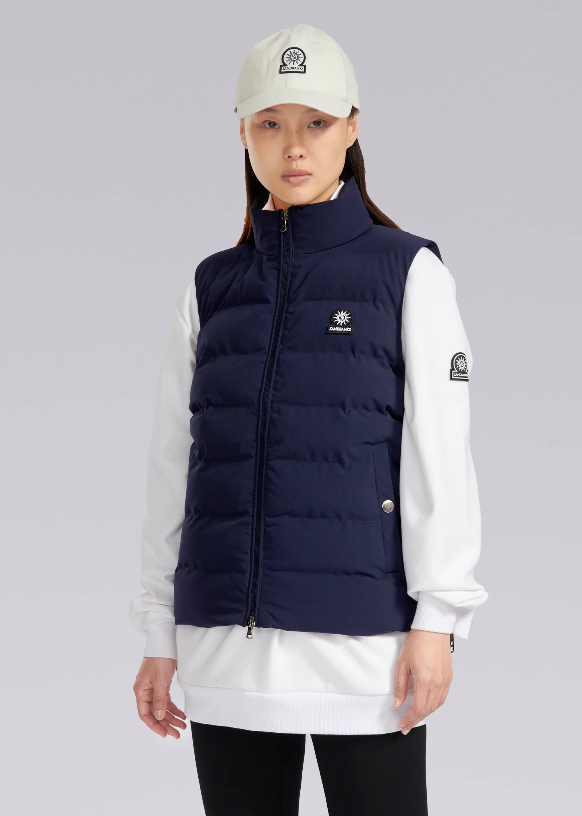 Sandbanks Marina gilet for women is made almost entirely from recycled plastic bottles. With a navy outer shell fabric, this gilet has high thermal retention, and features statement Sandbanks embroidery details.