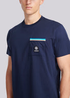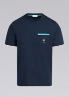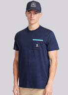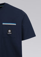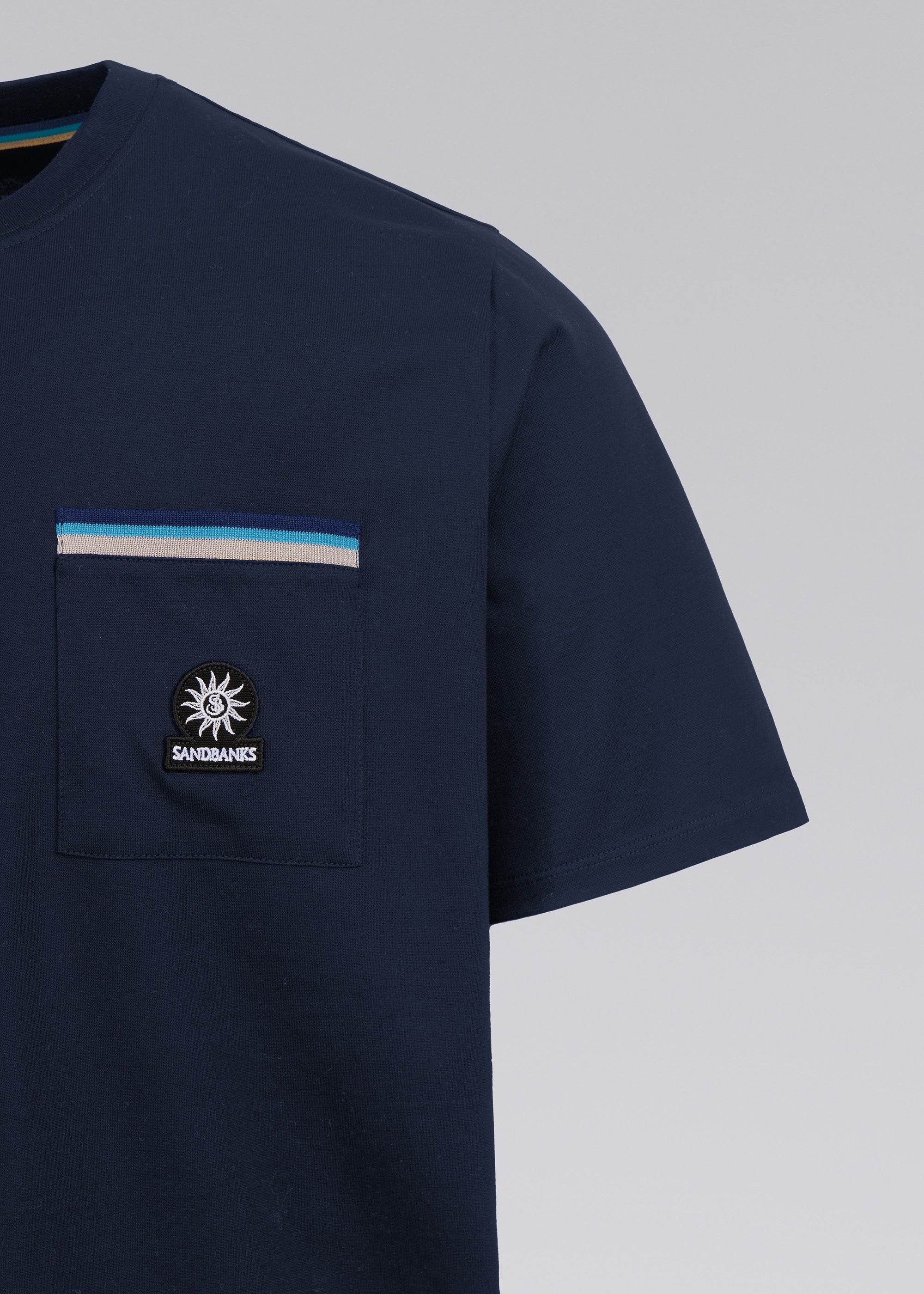 Sandbanks men's badge logo pocket t-shirt in navy, made from mercerised 100% organic cotton for a silky and luxurious feel. This relaxed fitting crew neck t-shirt features statement pocket with embroidered badge logo and tri-colour rib binding pocket.