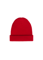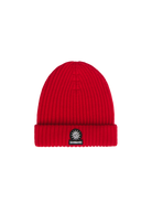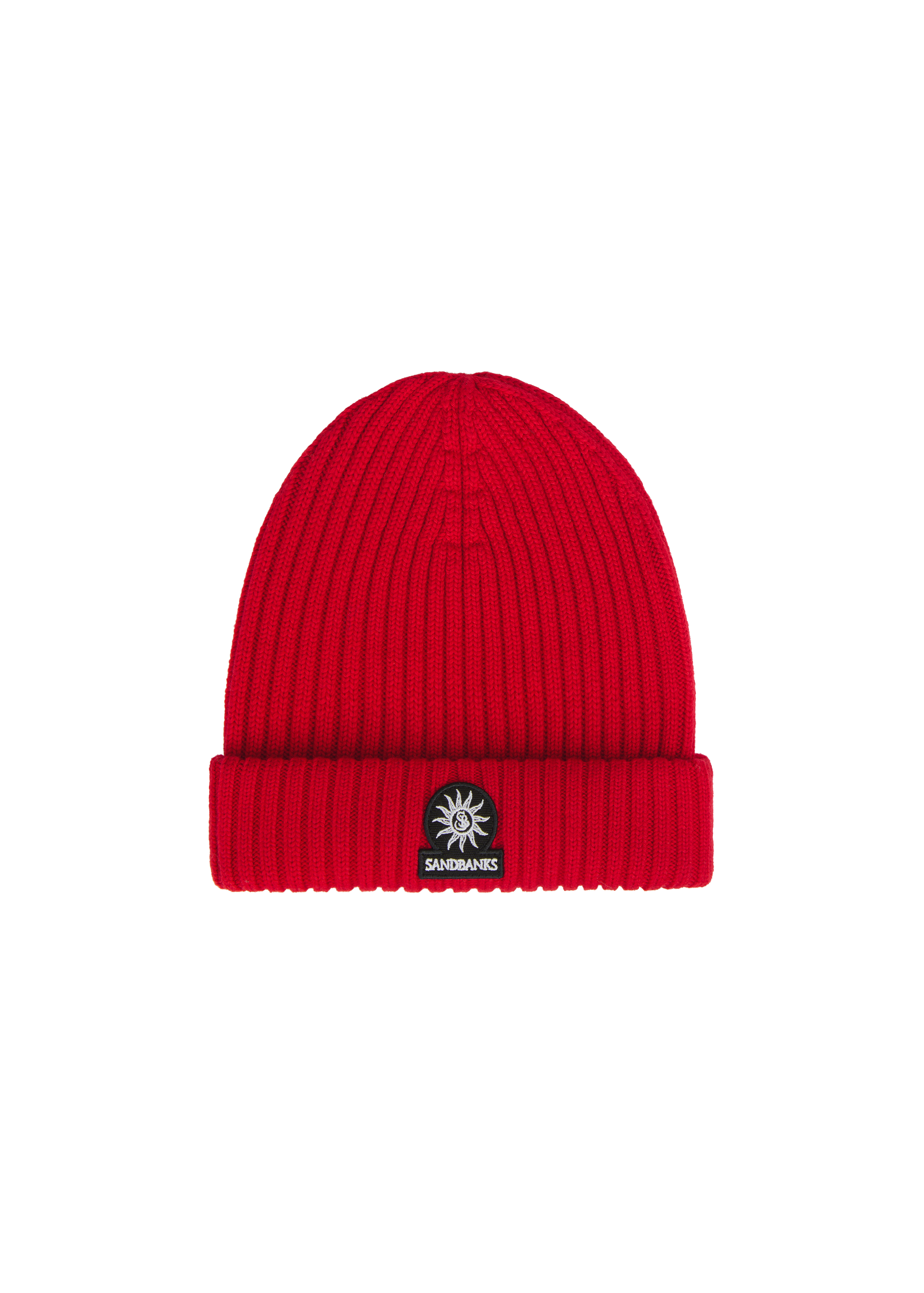 Sandbanks knitted badge logo beanie in red, made from 100% Merino wool. Merino wool is known for its softness, warmth, and moisture-wicking properties, making it the perfect material for a comfortable and functional beanie.