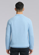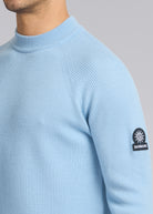Sandbanks mock neck extra fine Merino wool jumper in crystal blue, made from 100% Merino wool for a soft and luxurious feel. This fully fashioned jumper features a raglan sleeve design in a cardigan rib-like textured knit, Sandbanks logo badge embroidery, mock neck design and signature tri-colour neck binding.