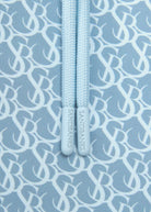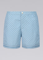 Sandbanks monogram resort shorts in crystal blue. These sophisticated swim shorts feature a high shine silver engraved snap closure, zip front and rear pocket with Lampo zip pulls.