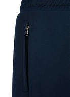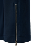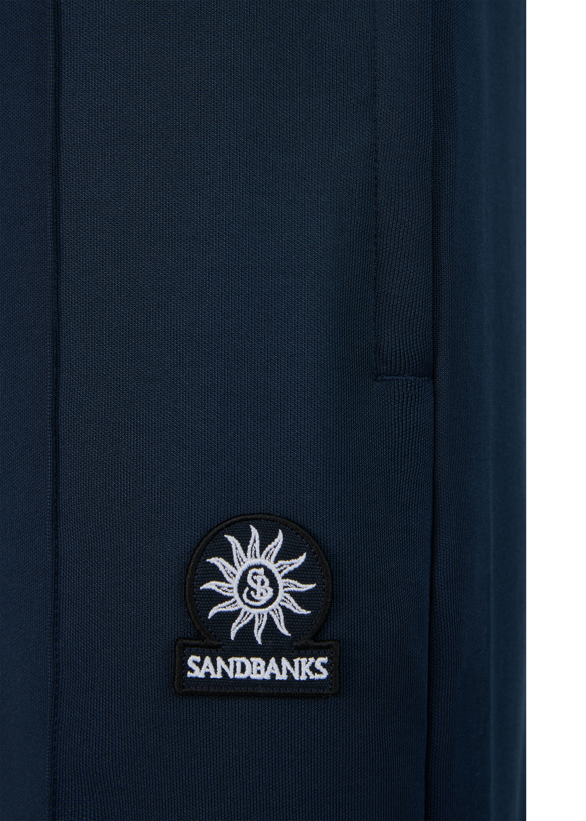 Sandbanks pleated tricot track pant in navy. Relaxed track pants crafted from smooth 360 GSM tricot fabric. Detailed with front and rear pleats, elasticated waist band with internal drawstring, signature embroidered badge, concealed zip side entry pockets and branded metal side zips at the hem. Designed to pair with the matching track jacket.