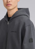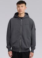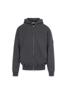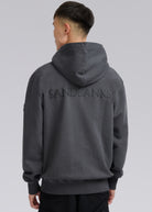 Our men's Sandbanks printed zip hoodie in anthracite is constructed with a 400gsm diagonal knitted fabric that features a slight brushed back for a superior soft feeling and warmth, whilst remaining breathable. Made from 100% BCI Cotton with statement Sandbanks raised rubber prints, tonal rubberised sleeve badge logo and a silver Lampo two way zip.