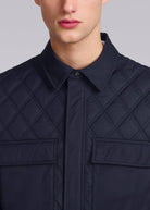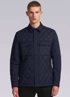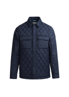 The Sandbanks Diamond Quilted Overshirt in navy made from a rip-stop nylon fabric and lined with an eco-down wadding. This lightweight jacket features; chest pockets, button close placket/cuffs, 2 way metal YKK zip, popper close side pockets, jersey lined rear and internal zip pocket.