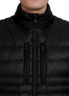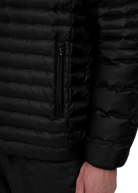 The Sandbanks Ripstop Micro Puffer Jacket in black is constructed from premium ripstop fabric with mixed-width baffles, delivering lightweight warmth in a slim silhouette. It features a quilted funnel neck collar with a concealed wind placket and zip pockets lined in Polartec® fleece for comfort and protection.