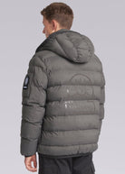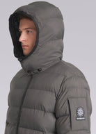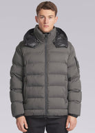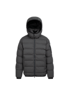 The Sandbanks shore hooded logo printed puffer in charcoal, a light weight short puffer jacket, constructed from a technical soft shell water resistant charcoal fabric and lined with a silky high shine black fabric for comfort. Featuring a rear tonal logo print, branded black elasticated cuff, hem and hood, black enamel components, side fleece lined zip pockets, patch sleeve zip pocket with a contrast felt/rubber badge.