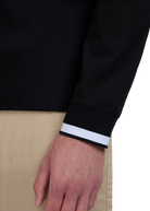 Sandbanks men's silicone zip long sleeve polo shirt in black, made from 100% mercerised interlock cotton. This slim fitting polo shirt features central Lampo silicone zip in white with print, sandbanks rubber badge on arm, white tipped knitted cuff and tri-colour back neck binding.