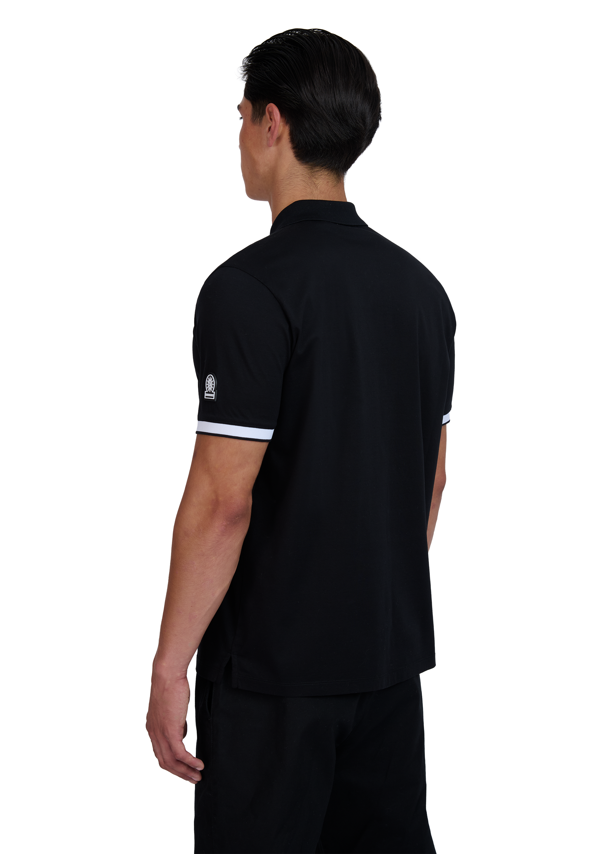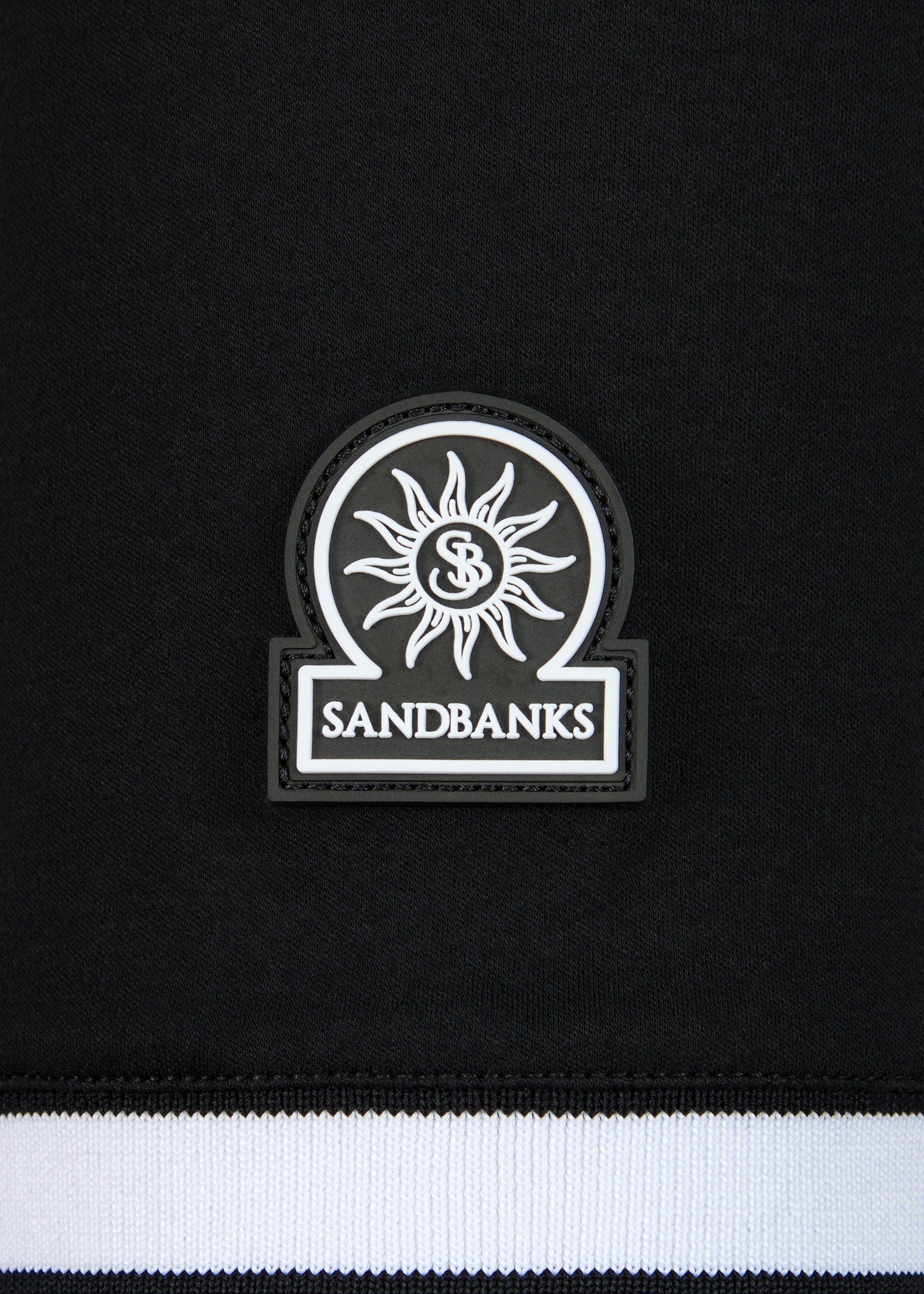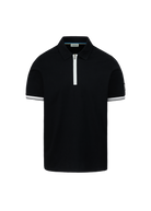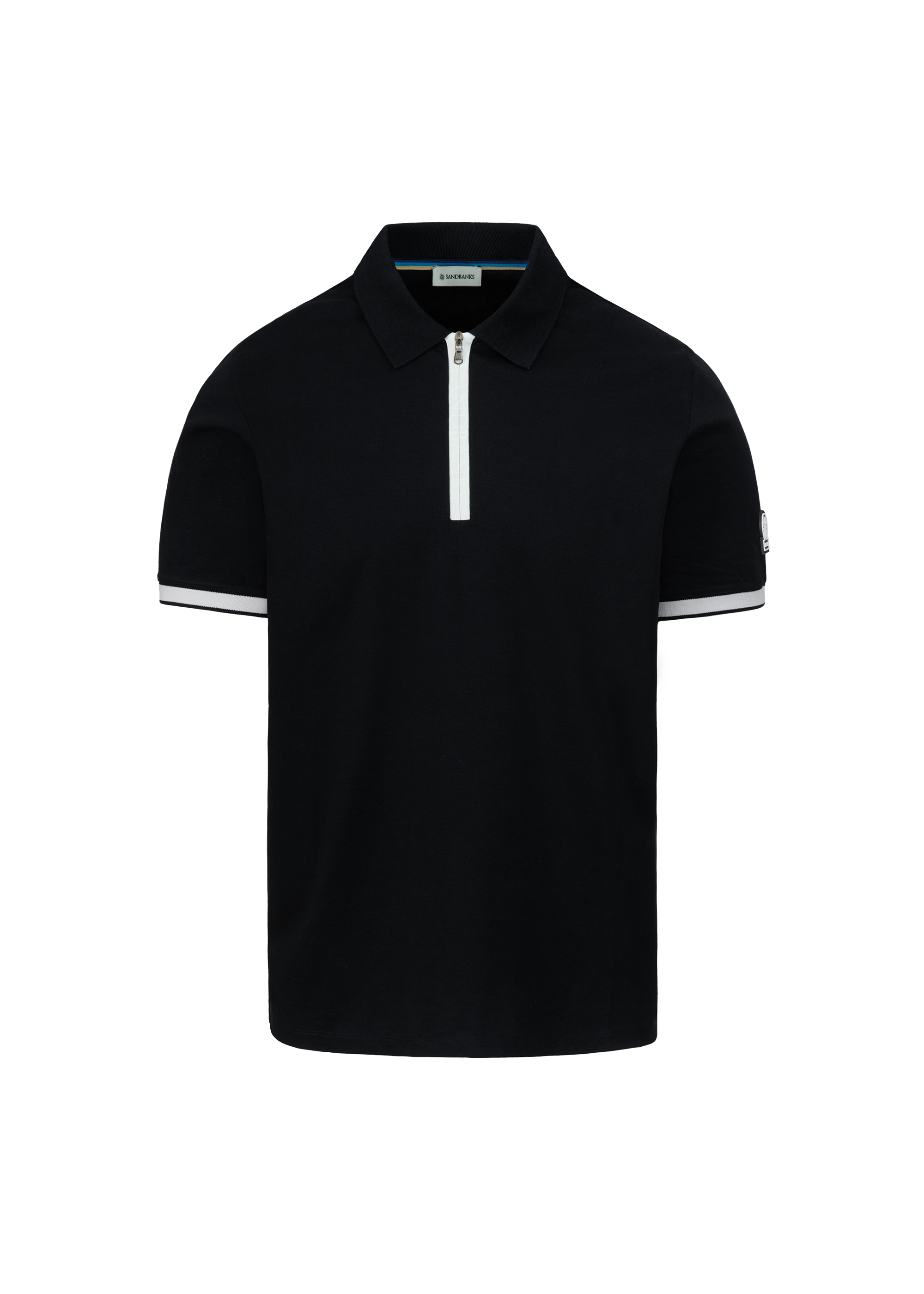 Sandbanks men's silicone zip polo shirt in black, made from 100% mercerised interlock cotton. This classic fitting polo shirt features central Lampo silicone zip in white with print, sandbanks rubber badge on arm, white tipped knitted cuff and tri-colour back neck binding.