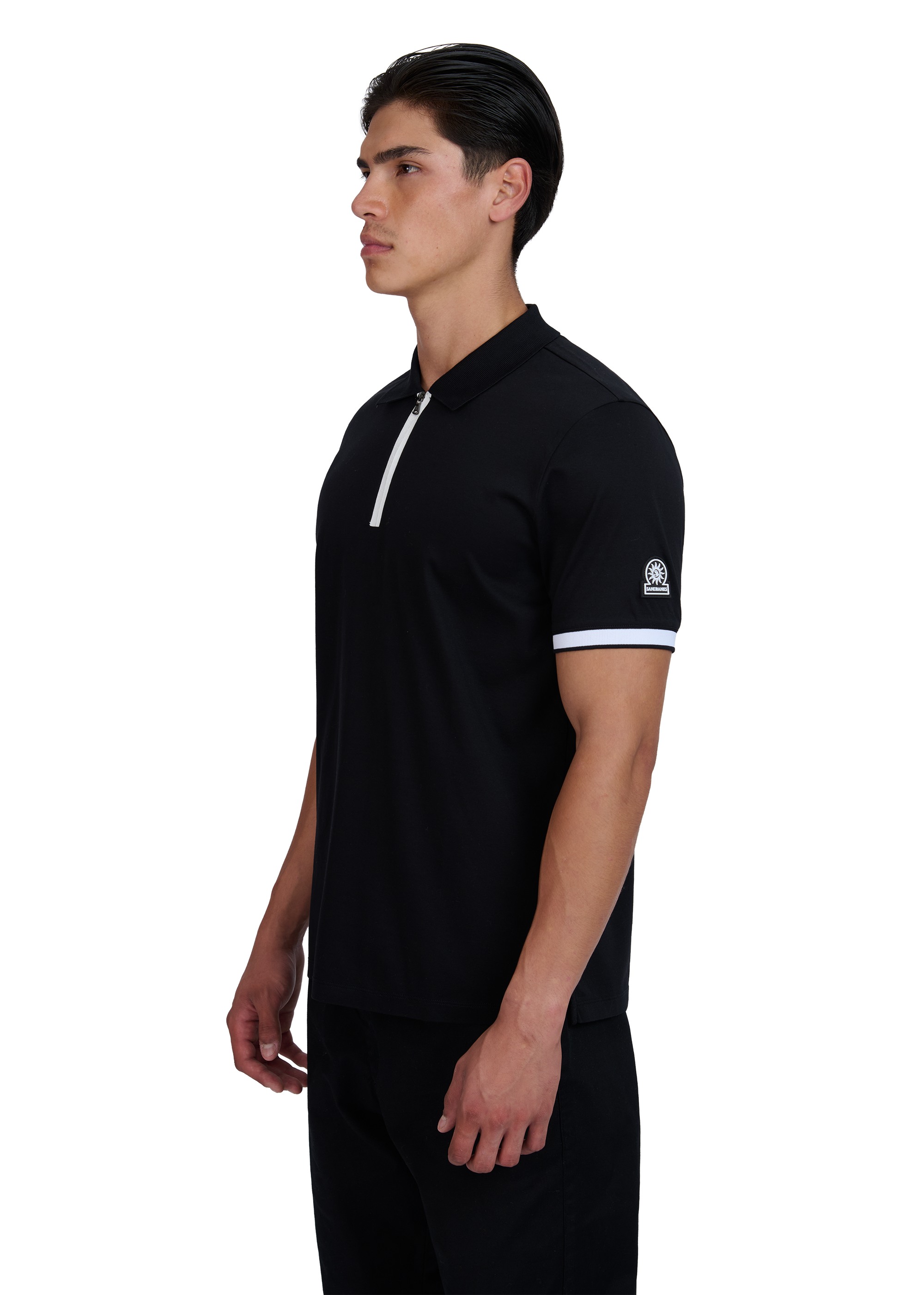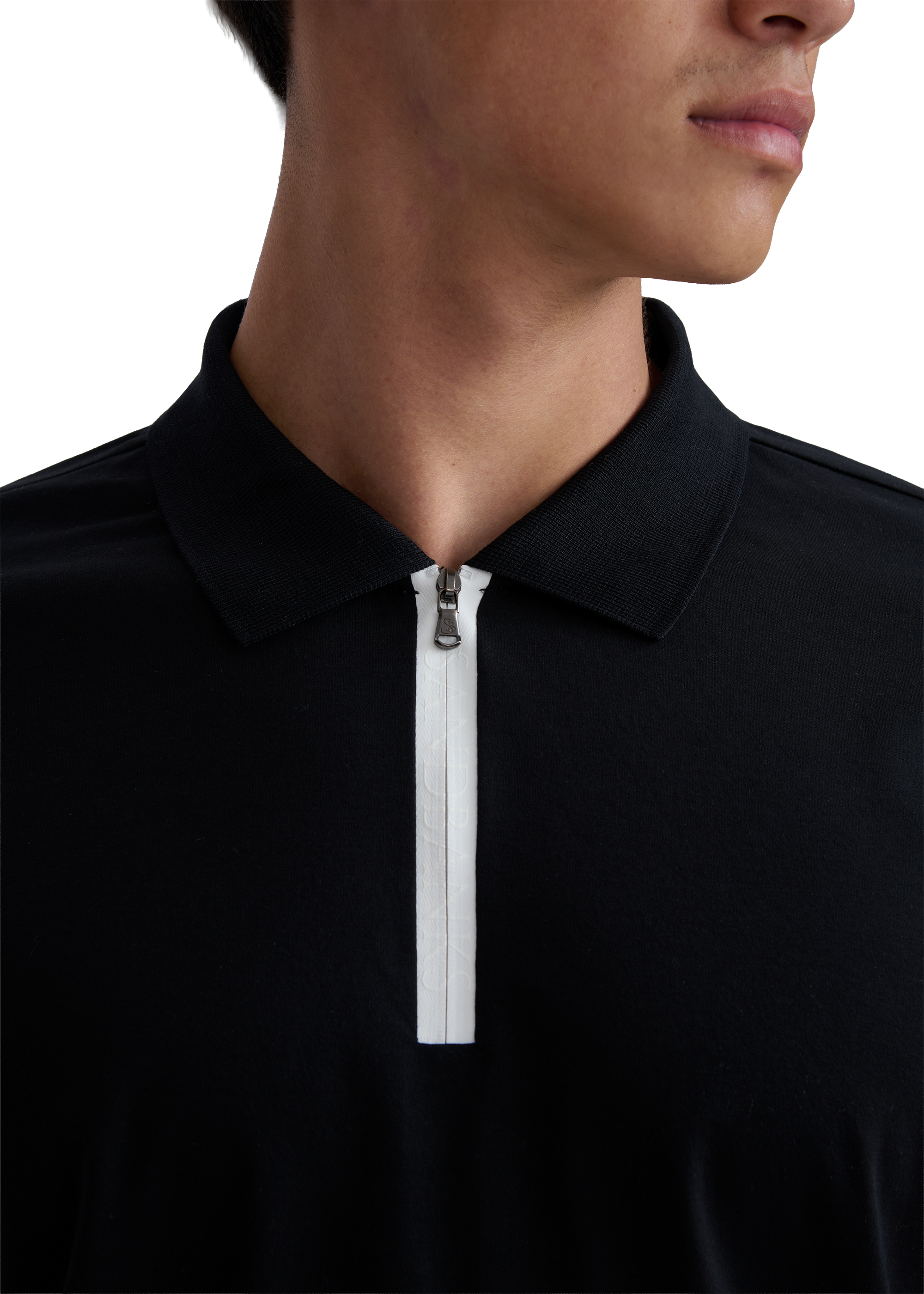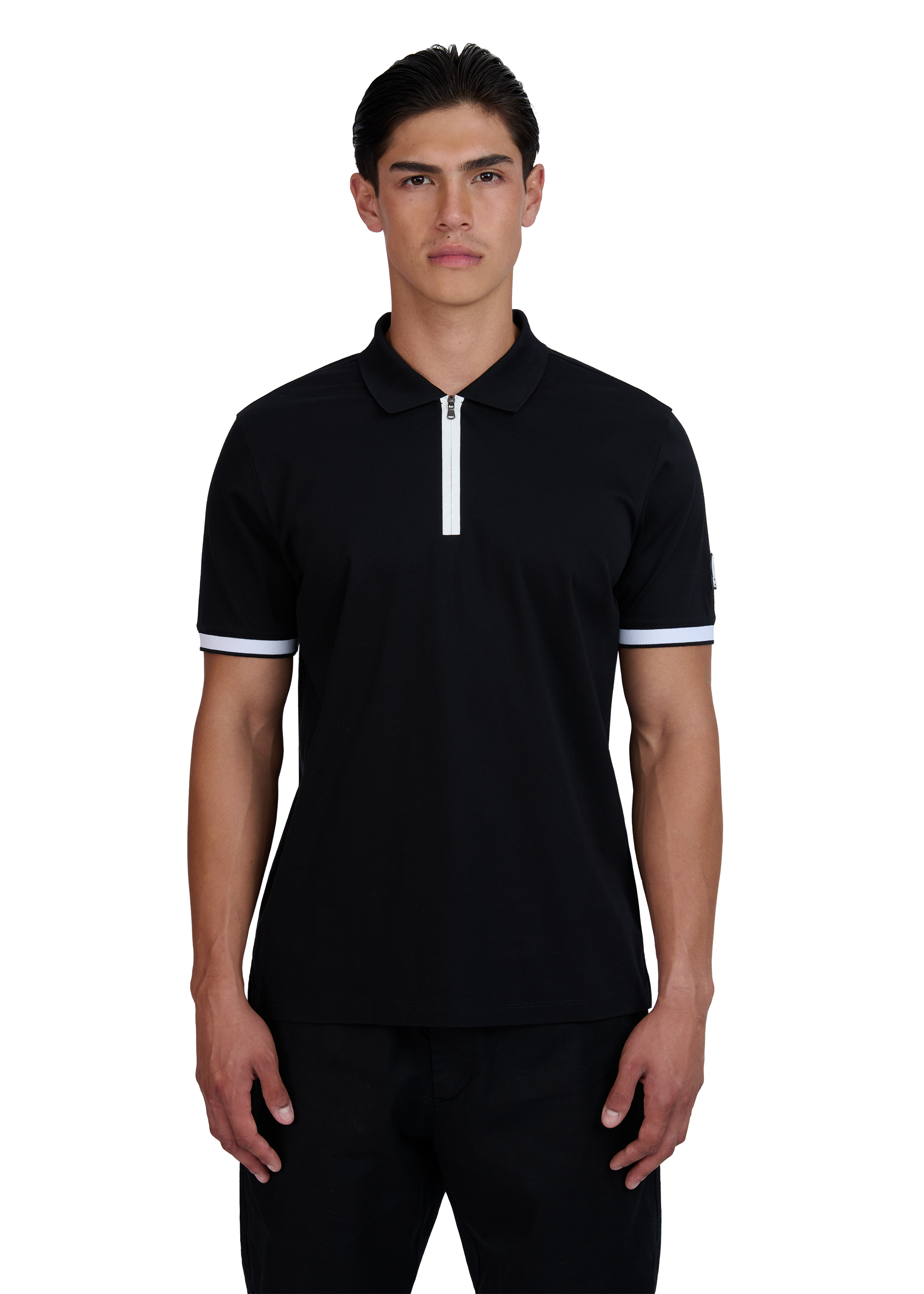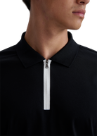 Sandbanks men's silicone zip polo shirt in black, made from 100% mercerised interlock cotton. This classic fitting polo shirt features central Lampo silicone zip in white with print, sandbanks rubber badge on arm, white tipped knitted cuff and tri-colour back neck binding.