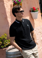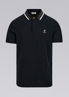 Sandbanks men's snap collar polo shirt in black, made from pique 100% bci cotton. This classic fitting polo shirt features a statement brushed gold snap popper on a collar stand, tipped ribbed collar, concealed button placket and embroidered chest badge.