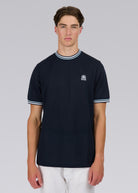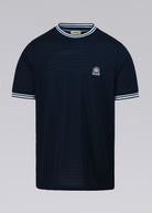 Experience the timeless charm and sporty appeal of our Sandbanks Jacquard T-Shirt in navy. Crafted from a loose woven polyester for a unique texture, this retro-inspired tee features a striped neck and cuffs in a complementary navy tone. Finished with a navy and white rubber badge.