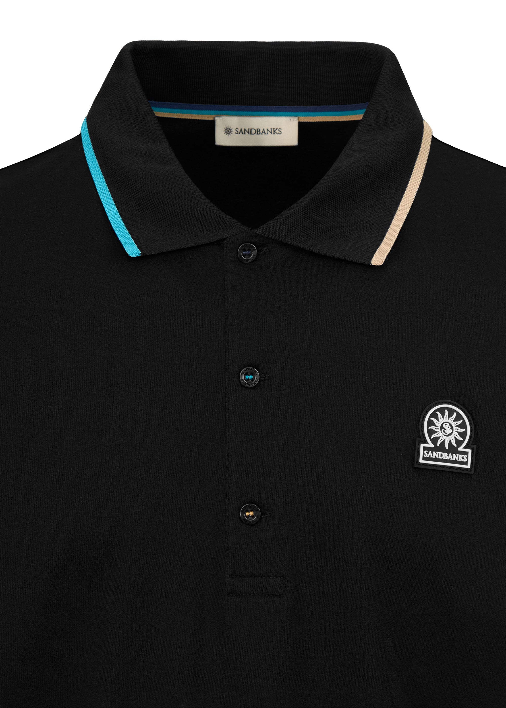 Sandbanks men’s tipped collar long sleeve Polo in black, crafted from 100% cotton. This slim-fitting polo shirt features a tri-colour tipped collar, three-button placket with tri-colour thread, and is finished with the Sandbanks silicone badge.