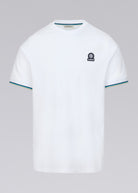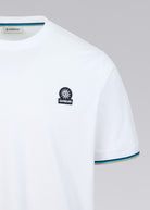 Sandbanks men's tipped sleeve badge t-shirt in white, made from mercerised cotton for a silky and luxurious feel. Featuring our signature tri-colour tipping on the sleeves and classics embroidered badge.