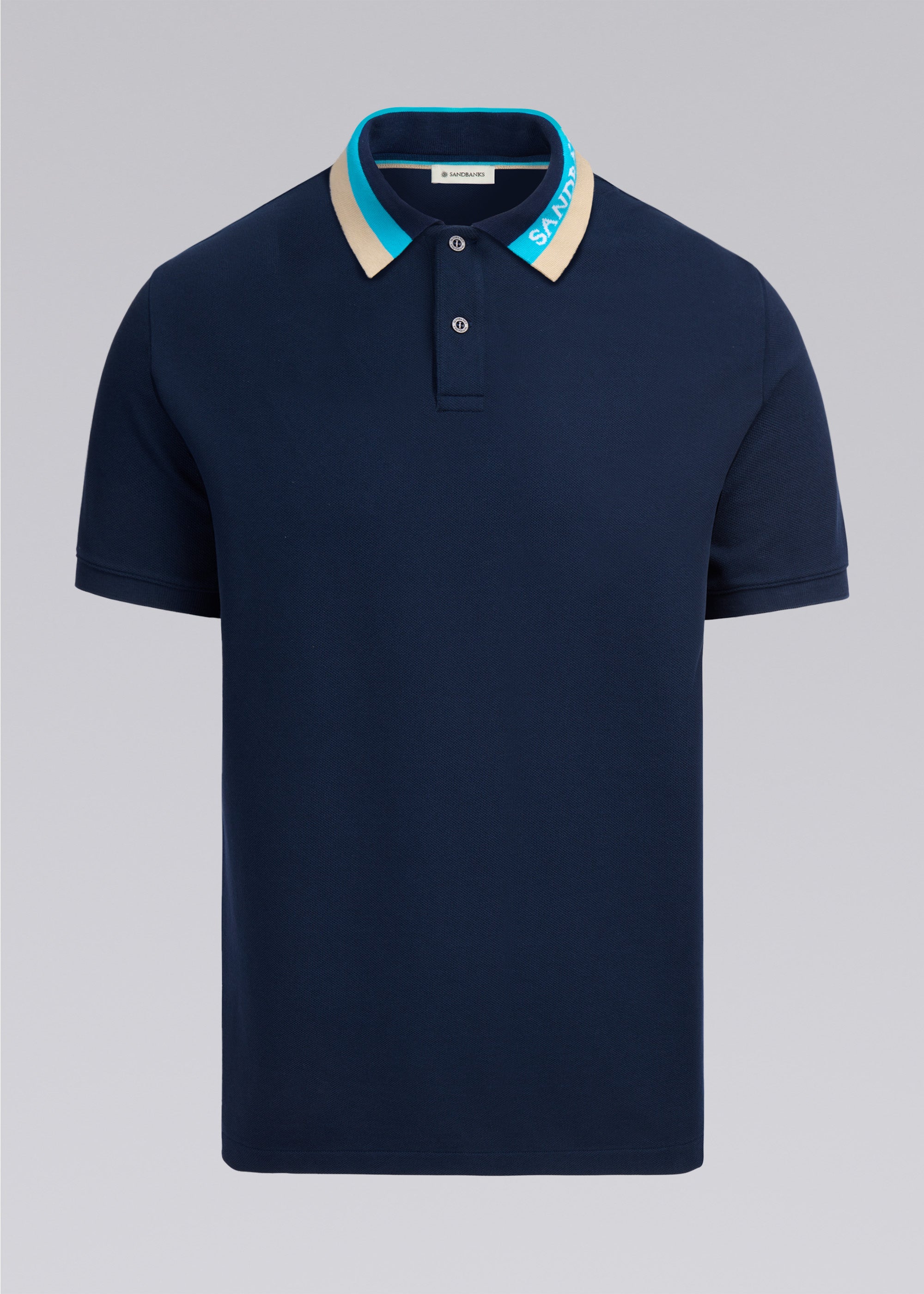 Sandbanks men's tri-colour collar polo shirt in navy, made from 100% organic cotton. This classic fitting polo shirt features statement tri-colour jacquard collar with contrast Sandbanks logo, tri-colour back neck binding and classic two button placket with engraved buttons.